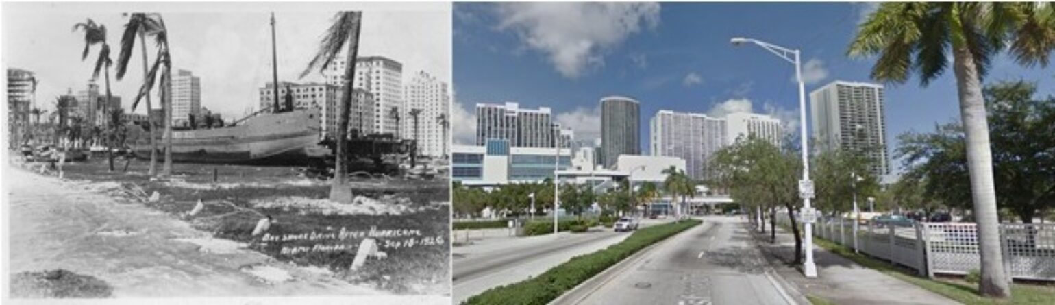 Bay Shore Drive in Miami then 1926 after Hurricane and Now. Source NOAA and Google Street View.