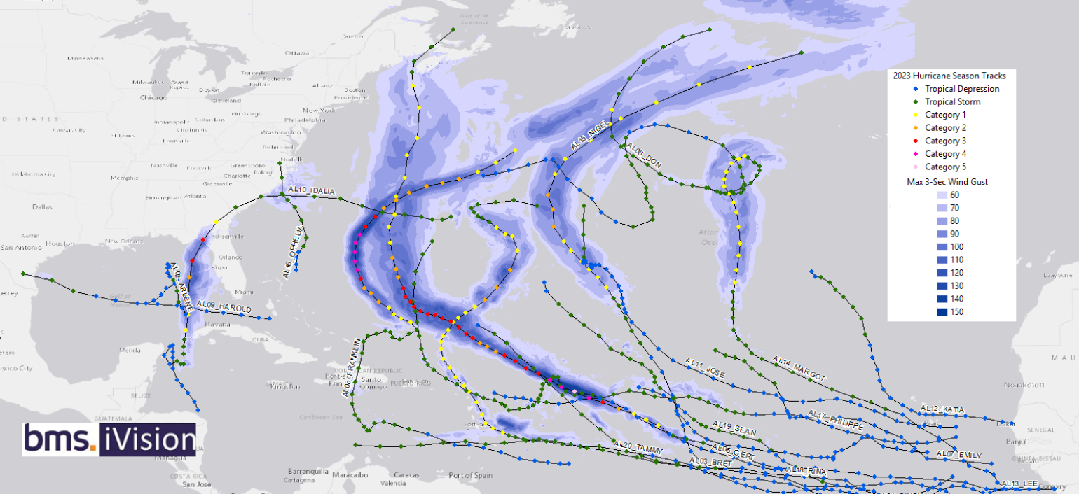 Like any named storm season, there are unique aspects and statistics. You can see our full BMS Re post on the 2023 Atlantic hurricane season here and the impacts on the insurance industry. There are a lot of interesting details, but as far as landfall and damage, the season had limited impacts on the insurance industry. In particular, only two hurricanes made landfall in the Atlantic basin: Category 3 Hurricane Idalia in Florida and Category 1 Hurricane Tammy in Barbuda. Florida did have a major event, but the industry will largely forget it in a few years as Idalia made landfall in a sparsely populated area and will likely result in an industry loss below $1B, but it should be a wake-up call for areas like Tampa that have now had two years in a row with a close call which would have been a game changer for he insurance industry after several years of large named storm losses.