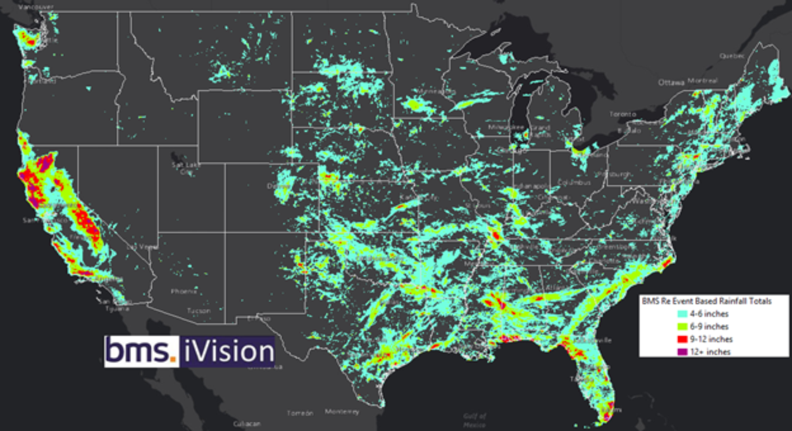 With a warming world, one should expect more extreme rainfall events as warmer air can hold more moisture. 2023 had several heavy rainfall events across the U.S., from the wet extreme rainfall that relieved the drought conditions in California and resulted in record snowfall to the historic flash flood event that occurred in Fort Lauderdale, Florida, and the surrounding areas on April 12, 2023. The Fort Lauderdale area reported 25.6 inches of rain within approximately 12 hours. Of course, the insurance industry just saw major rainfall in the Northeast in what was an unusual December rainfall event, resulting in major flooding for the areas. So overall, while the overall take-up rate of flood insurance is low, it is still growing across the private flood insurance industry. This means these major rain and flood events will likely have further reaching impacts than on personal and commercial line losses. Specifically, these heavy rain events typically impact infrastructure, making it harder for communities to and businesses to recover from such events. Our BMS iVision has aggregated Verisk Respond data to show major rainfall events associated with PCS loss events during 2023, as shown in the map below.