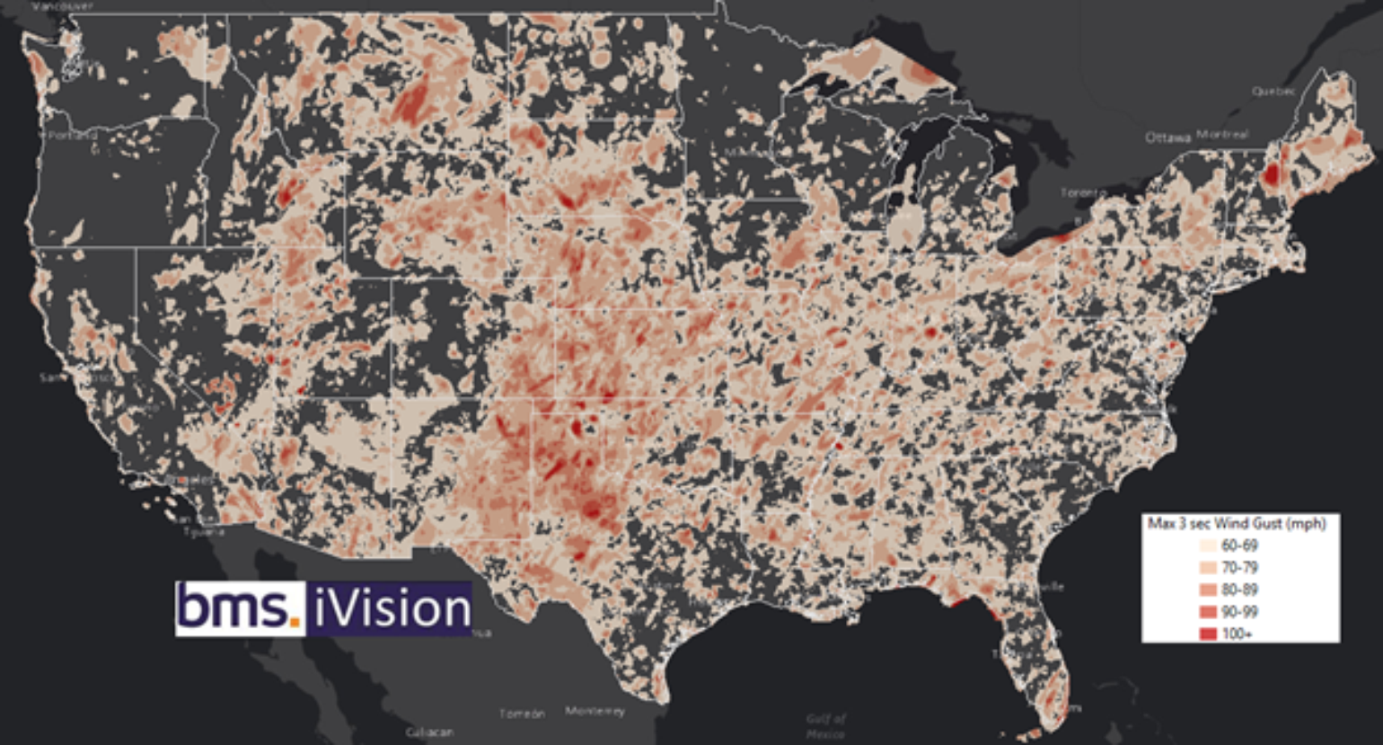 A lot of the country experienced at least one thunderstorm wind event over 60 mph, and combining that with hail events can be quite devastating in terms of total hail impacts. Some regional highlights are large amounts of hail and wind across Texas, such as areas along the I-35 corridor. Florida saw an unusual amount of hail. The front range of the Rockies also saw wind and hail events, which led to some costly events for the insurance industry. These BMS iVision PCS events will now be archived in our cat events module within BMS iVision, allowing clients to go back to 2012 to stress test severe weather events to better understand the maximum potential loss for their current inforce portfolio.