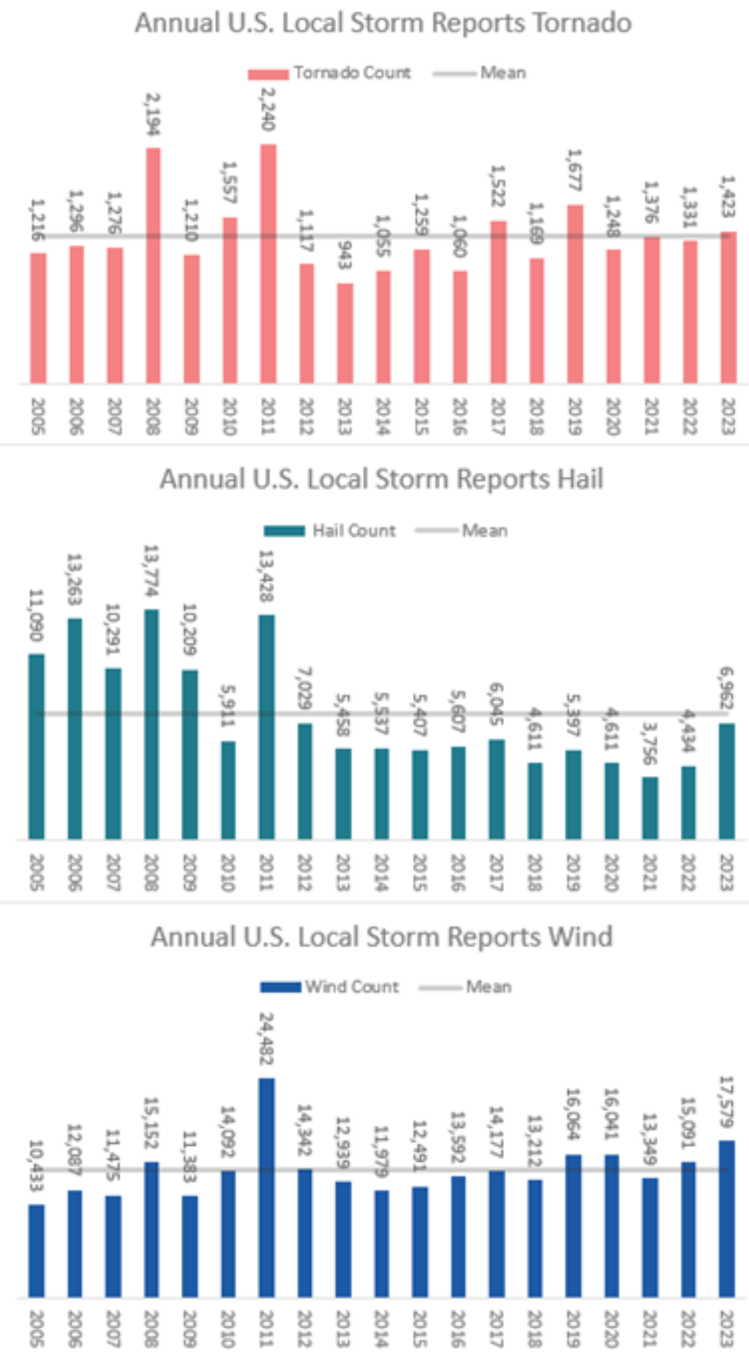 As highlighted earlier, 2023 was the year of severe weather impacts on the insurance industry, driving over $50B of insurance losses. However, what is particularly unusual is that overall, the measurements of severe weather observations were nothing record-breaking. In many aspects, they are on par with the expected long-term average for their respective perils. This suggests severe weather losses are much more complicated than just the occurrence of severe weather, and other factors could be driving the loss beyond where severe weather occurs. Recently, the IBHS held a webinar detailing how issues beyond record-breaking hail and tornado outbreaks are causing increasing losses in severe convective storm events. They demonstrated how IBHS research has delivered a deeper understanding of these loss drivers and identifies proven solutions to mitigate vulnerabilities through field and laboratory research. This starts with better asphalt shingles and how there is a movement with better building codes and products to reduce future severe storm losses. With that being said, losses are still being driven by replacing roofs that likely do not need to be replaced due to social actions within the roofing industry and policyholders. Below is the chart of the severe weather observations the National Weather Service collected from various severe weather perils. These methods have been consistent since 2005, which shows that 2023 is an average year across the perils of wind damage, large hail, and tornadoes.