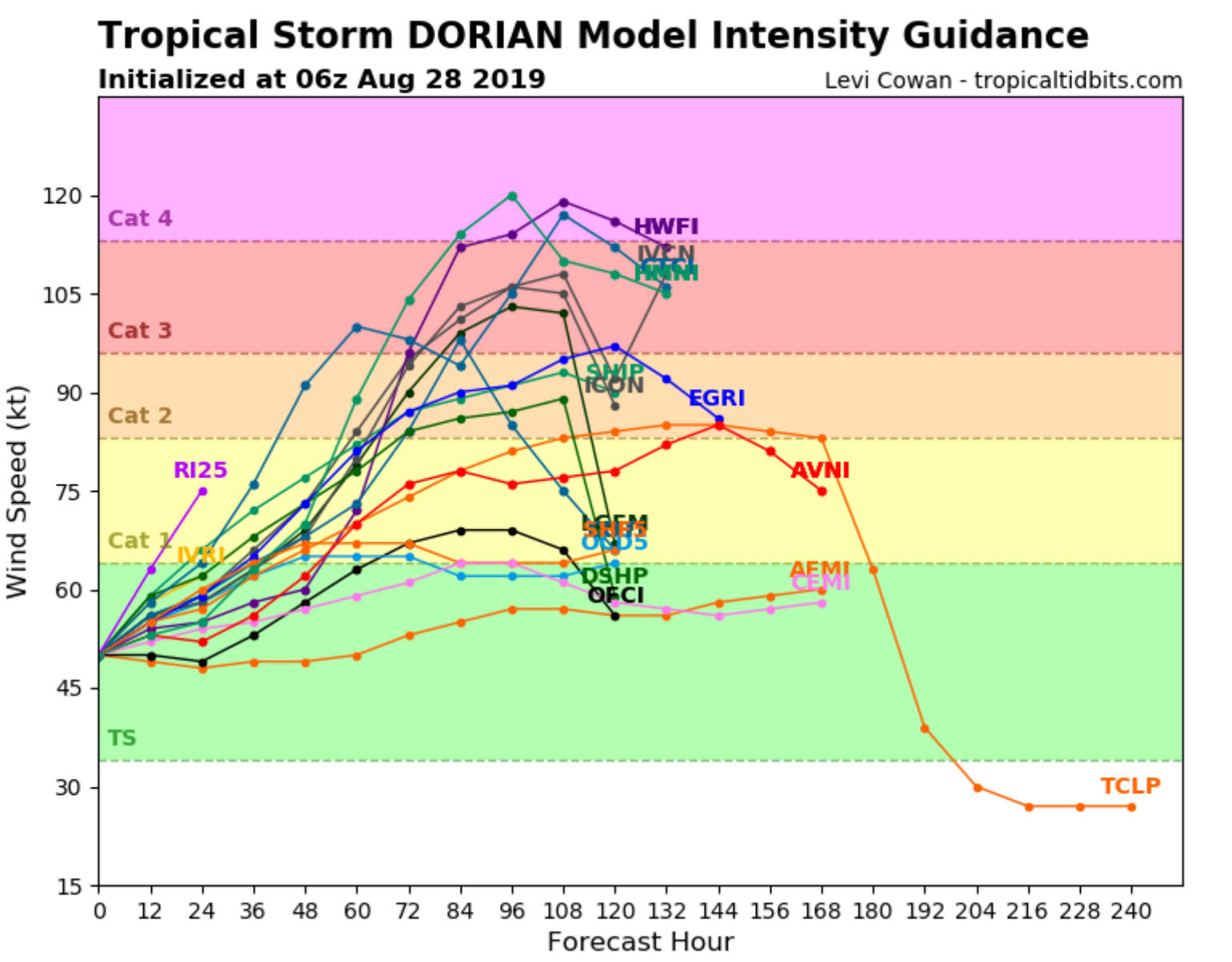 Intensity forecasts are tricky, and it’s much too early to speculate. Dorian could be an anywhere from a weak category 1 hurricane, with just heavy rain and minimal wind threat, up to a major hurricane. However, with the warm sea surface temperatures over the Bahamas and lower wind shear, a stronger storm should be expected and the trend in intensity forecasts over the last 12 hours suggests this.