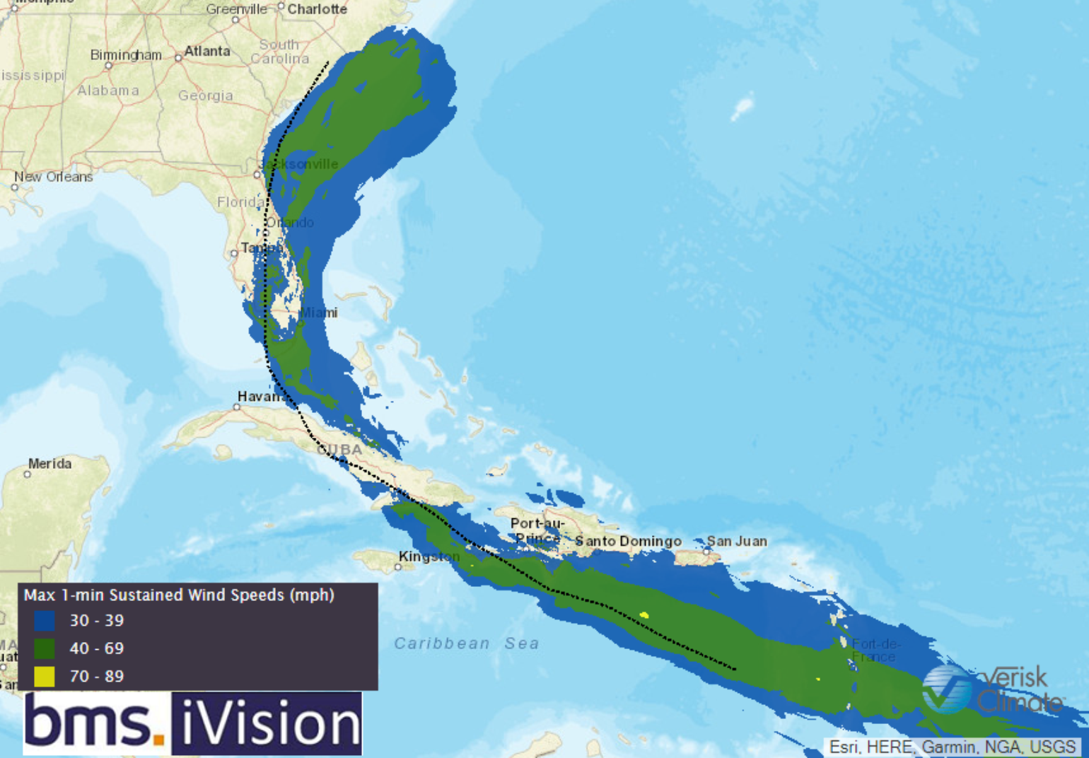 At this time the U.S. insurance industry impacts appear to be minimal given the weakened state of Elsa. The BMS iVision Verisk Respond Hurricane forecast shows Elsa’s center tracking along the southern coast of Cuba and turning north over the Straits of Florida. This will leave little time for Elsa to reorganize if its low-level center even makes it this far, which is doubtful based on observations this morning.
