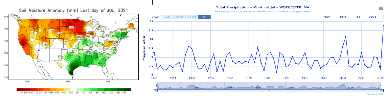 Time and time again we have seen a scenario like this play out. Examples include: Harvey 2017, Florance 2018, more recently with a weak tropical storm, or a hurricane making landfall and stalling out and causing massive amounts of flooding. Complicating the issue with Henri is that southern New England has been wet and the soil is already saturated. Just recently the remnants of Tropical Storm Fred have provided a wet ground. Boston, MA, and Worchester, MA each had their wettest July on record, and Hartford, CT came in second place. Near a foot of rain has fallen in Worchester, MA since July 1. The ground is saturated and this wet ground will further elevate tree fall risk from this potential prolong wind event.
