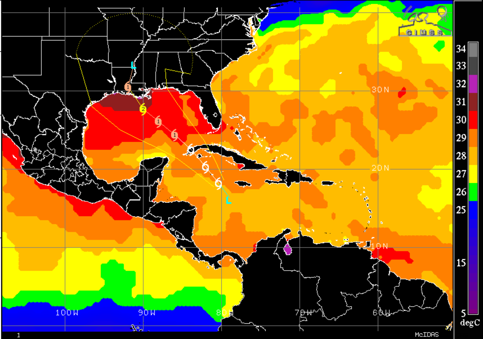 Some of the warmest water in the Atlantic Basin is right along the northern Gulf Coast. Along with all the historical storms mentioned above that have intensified in the Gulf of Mexico, many recent storms intensified right up until landfall. Given that the warm waters range from 87 – 89 degrees F, there is a concern if any named storm enters these waters that rapid intensification can occur.