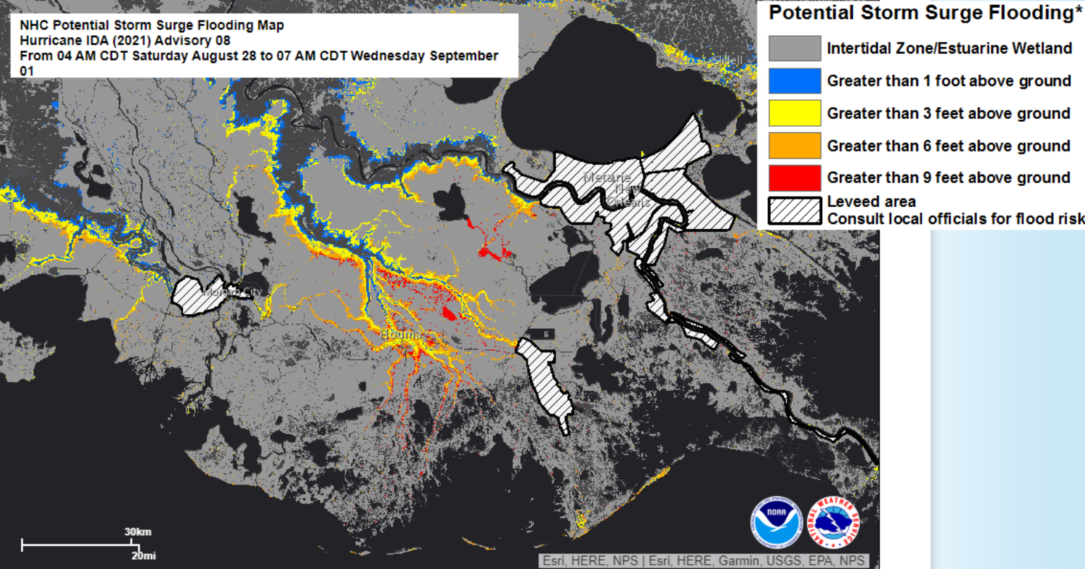 Storm Surge is also a major concern and will ultimately depend on the track and size Ida becomes over the next 24 hours. Peak surge is expected to be 10 – 15 feet from New Iberia, LA to Grand Isle, LA, with up to 7 – 11 feet of storm surge expected around New Orleans. This is below the design threshold of the New Orleans levee system. In cities along U.S. 90 Highway, the surge levels could be closer to the design threshold for the levee system protecting cities like Morgan City, LA, Cut Off, LA, and Galliano, LA. Cities like Houma, LA have limited protection and will be impacted to a greater level. However, once again, as mentioned in the post yesterday, the overall system has seen resiliency improvement. Since Hurricane Katrina in 2005 $14.5 billion has been spent upgrading cities' flood defense systems. Hurricane Isaac brought 12 – 14 feet of storm surge into the city of New Orleans and it seemed the new improvements performed marvelously. This should give the insurance industry confidence that the projected storm surge of 11 feet can be managed. However, once again the storm surge forecast is tied to the overall intensity and size of Ida before landfall. Along with the NHC forecasted track guidance the NHC has a very detailed storm surge forecast that should be used as guidance to storm surge impacts along the Louisiana coastline.