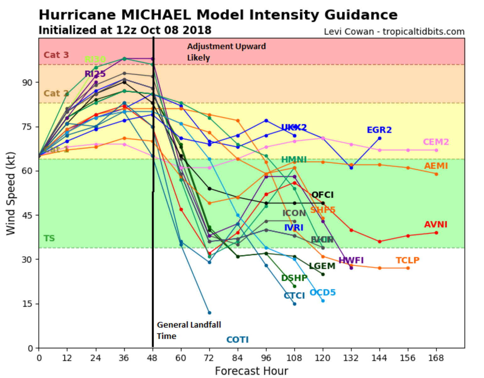 The other factor to consider that may limit intensity is the westerly shear near the storm as it tracks northward toward the Florida Big Bend Gulf Coast. However, despite 30 knots of wind shear, Michael has still managed to strengthen over the last 24 hours and has already had an impressive 982 mb central pressure. If wind shear weakens, Michael could continue to strengthen and potentially make landfall as a weak Category 3 hurricane.