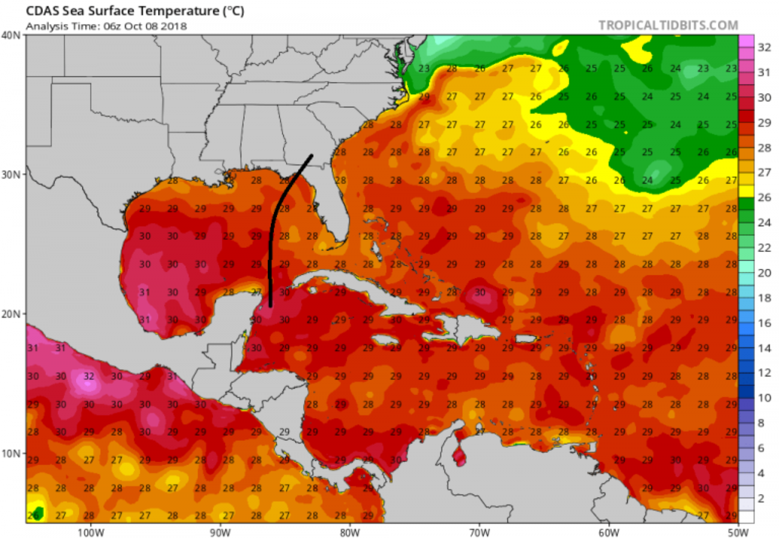 Sea surface temperatures (SSTs) are average to slightly below-average, (29°-30° C or 84°-86° F) in the Western Caribbean and Eastern Gulf, but it is still plenty of fuel to feed Michael as it heads northward.