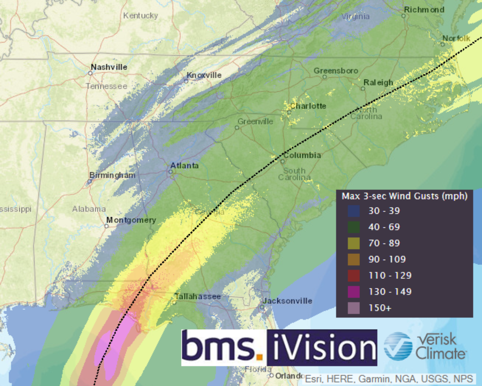 Using Verisk Weather Solutions forecasted wind swath allows BMS clients to better understand wind impact to specific risks. Currently, the wind swath suggests a radius of maximum winds to be about 26 miles wide, which is fairly tight for a hurricane. Shortly after landfall, frictional effects rapidly weaken the maximum wind speeds inland. In addition, Tallahassee should be spared any hurricane-force winds, which is a bit of better news, as insured loss will be limited in this large metro area. But, some damage and power outages could still occur.