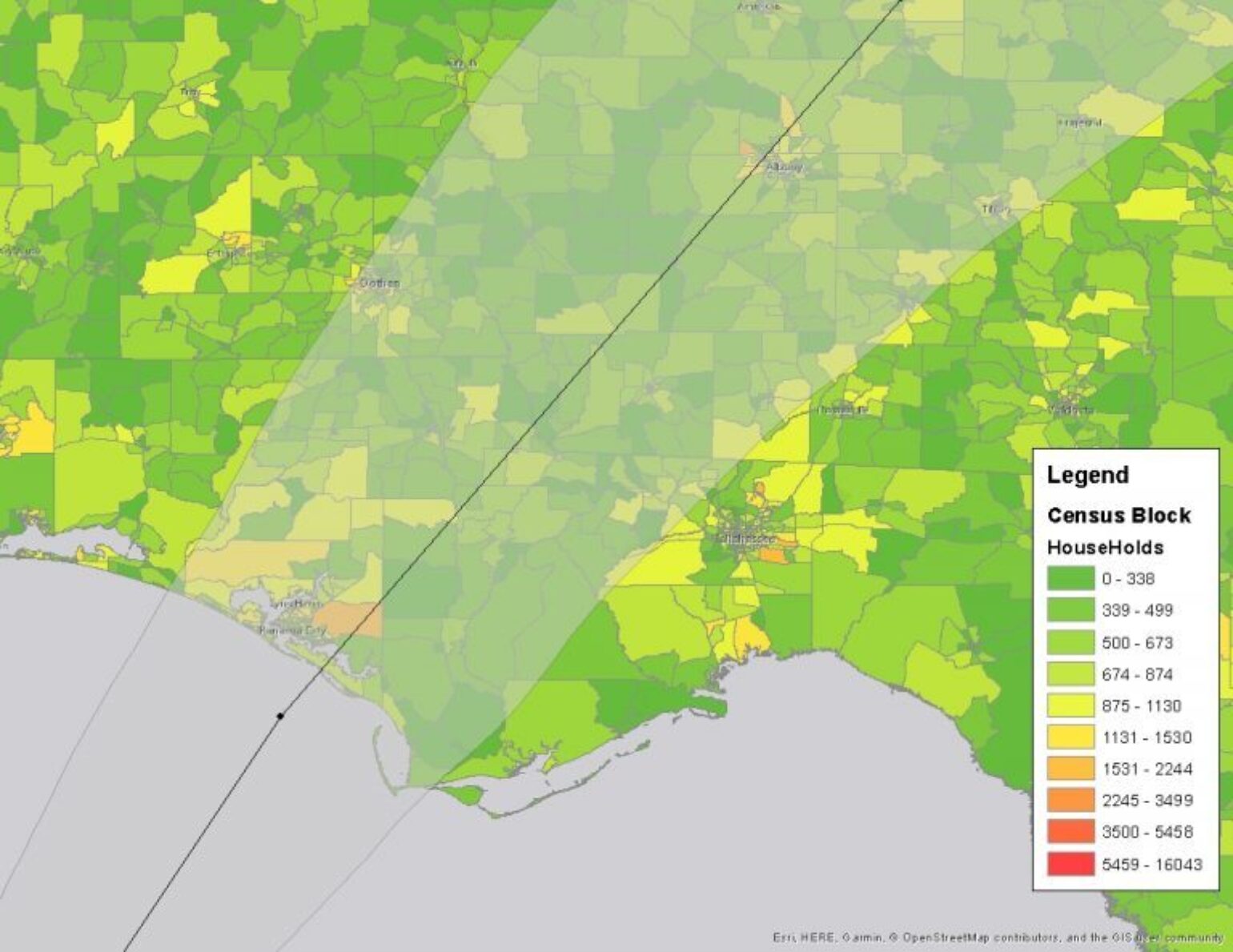 Here we take the details of the iVision wind swath with the aerial imagery applied to the base map. The radius of maximum winds is forecasted to be about 22 miles at landfall. The strongest winds are forecasted to impact the first 14 miles of coastal exposure as indicated by the first short green line, with the red line indicating areas of higher development. Most of the strongest winds will be over Forest or Agriculture land. Click on image for more detail.[/caption]The building codes inland are not as strong as in the coastal areas, such as Panama City, Fl. The older age of the homes inland, coupled with the potential for tree fall, make for uncertain loss estimates. Hurricane Irma illustrated that there are clearly loss creep issues occurring across the state, which will also add to the overall uncertainty around potential losses to the insurance industry. An early look at some of the catastrophe model guidance suggests a mid to high single-digit billion dollar loss event, but the impacts to Panama City need to be watched closely.