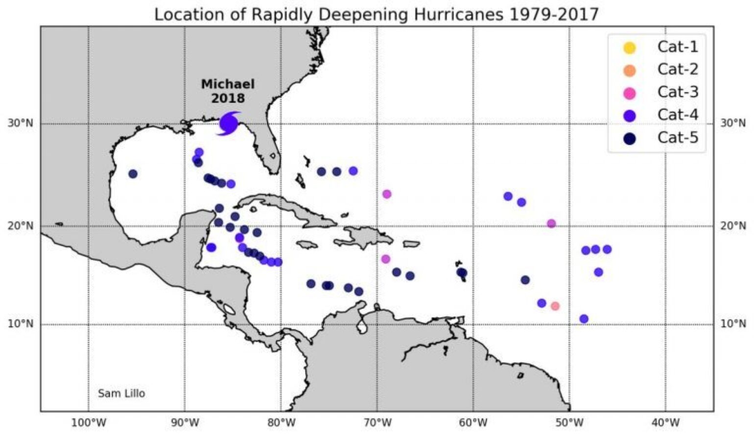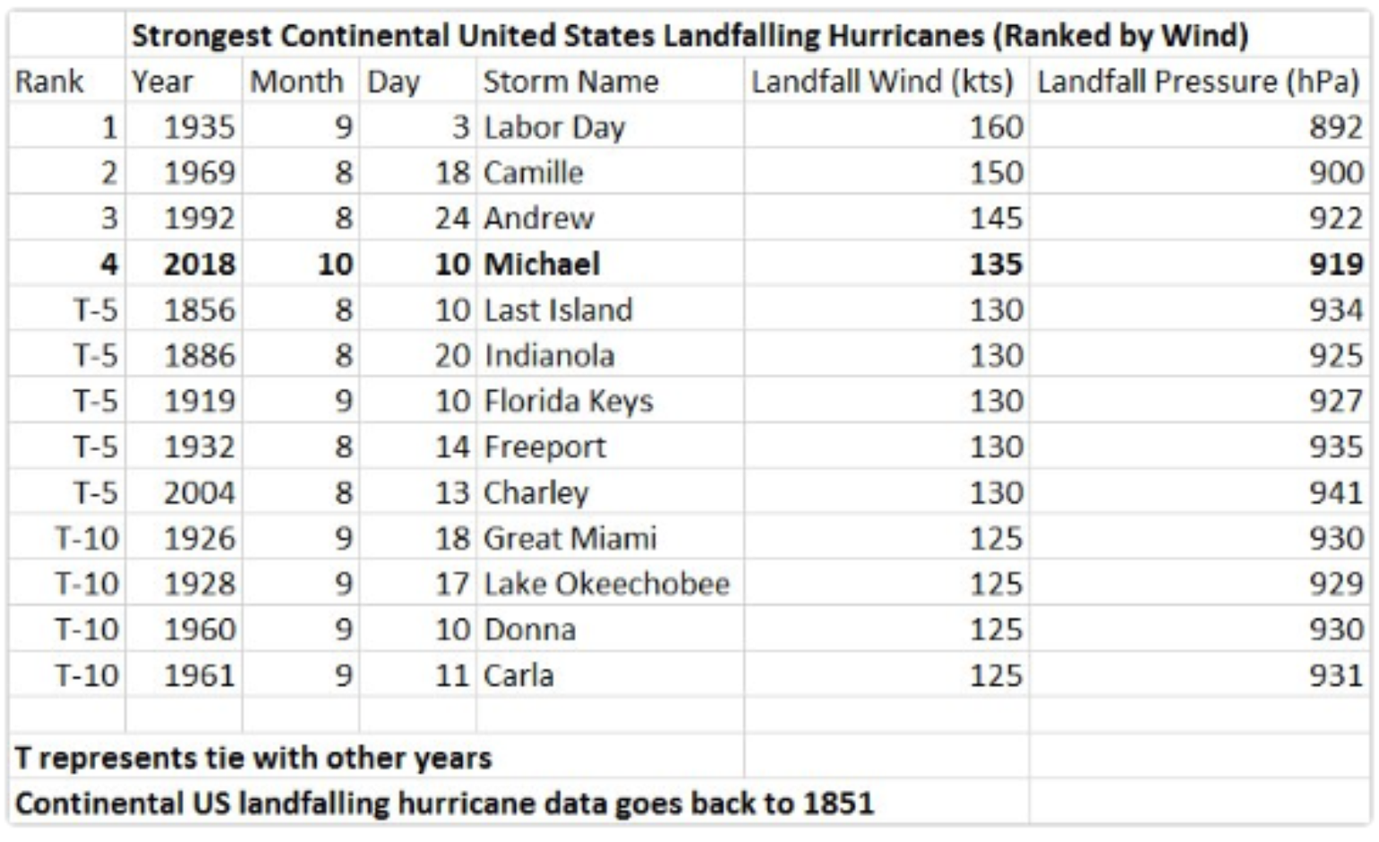 This is truly a historic event. As I mentioned yesterday, this storm was only a marginal threat six days ago when it first appeared on some of the long-range model guidance, which illustrates that the scientific community has a lot of work to do in terms of intensity forecasts. In fact, Michael’s rapid deepening, which is defined as less than or equal to a pressure drop of 42 mb in 24 hours, is rare. Only 23 hurricanes in the last 38 years have done this, and Michael was the only hurricane to have this occur right at landfall.