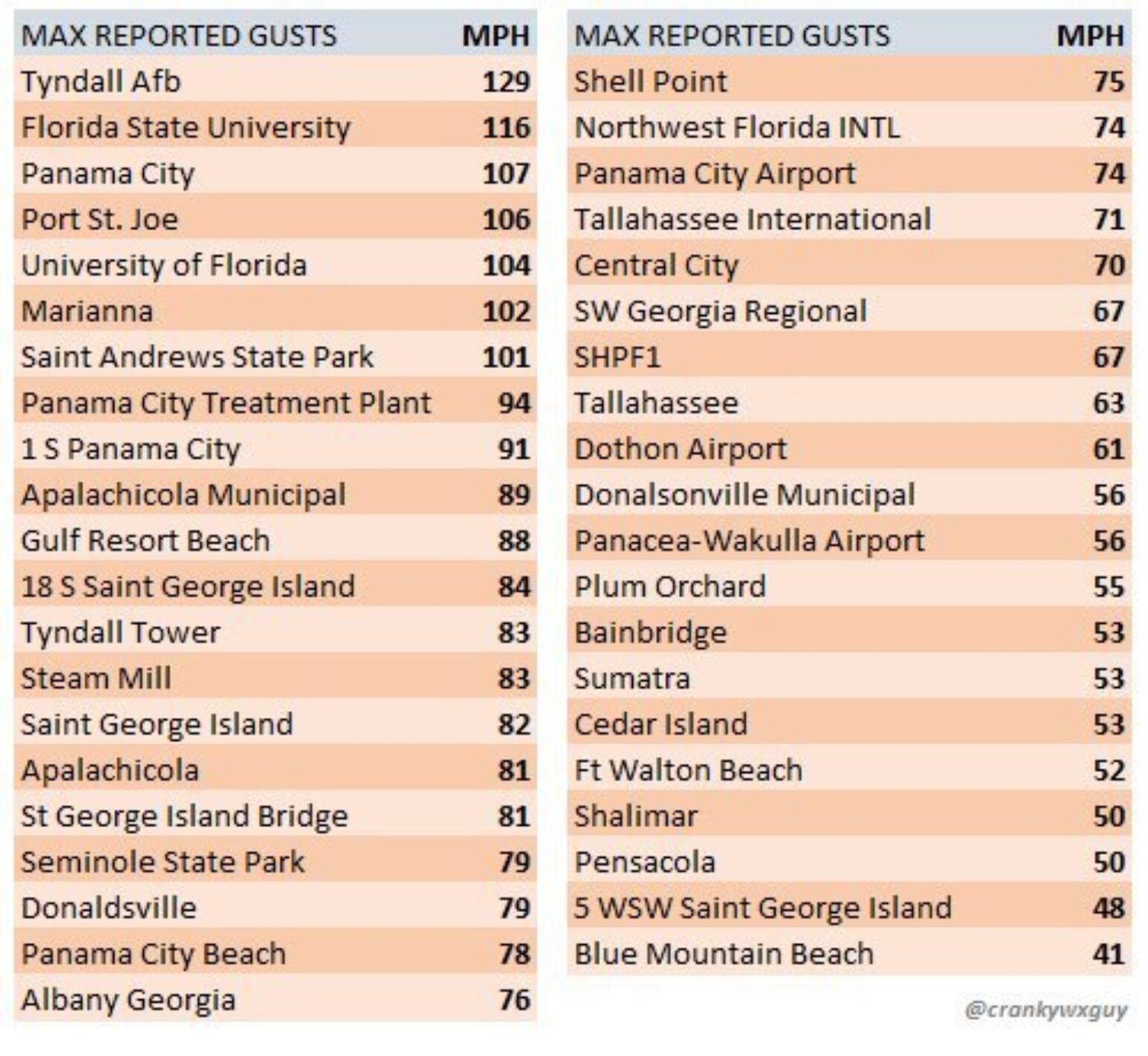 As the storm crashed ashore, winds gusted to as high as 129 mph along the coast from Panama City to Port St. Joe. The highest storm surge reading that has been observed so far was an inundated level of just over 8.57 feet in Apalachicola, FL - which is the 3rd highest on a new record. Other areas likely recorded their record highest.