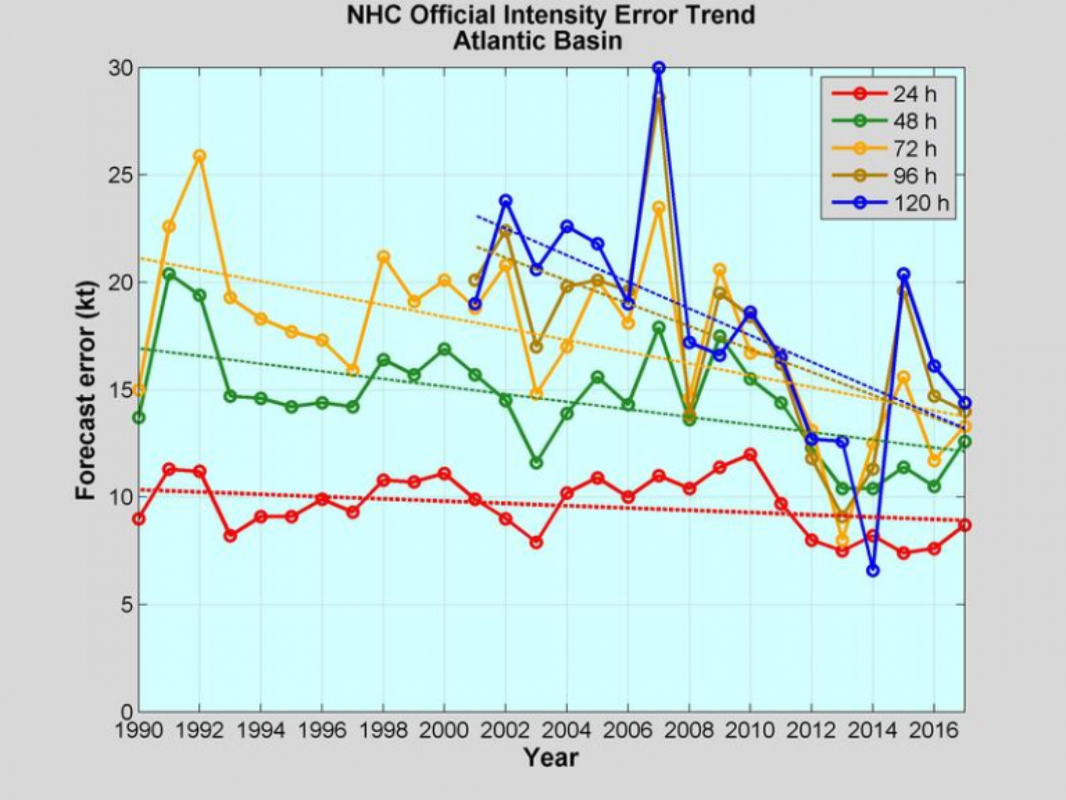 With Florence’s center core finally showing up in the long range radar, it would appear the end game is finally near. The biggest change in the forecast since the start of the week has been the change in intensity, which is a known issue in hurricane forecasting. There has been some general improvement in skill over the last decade, but more recently over the last five years, intensity forecasting has been challenging.