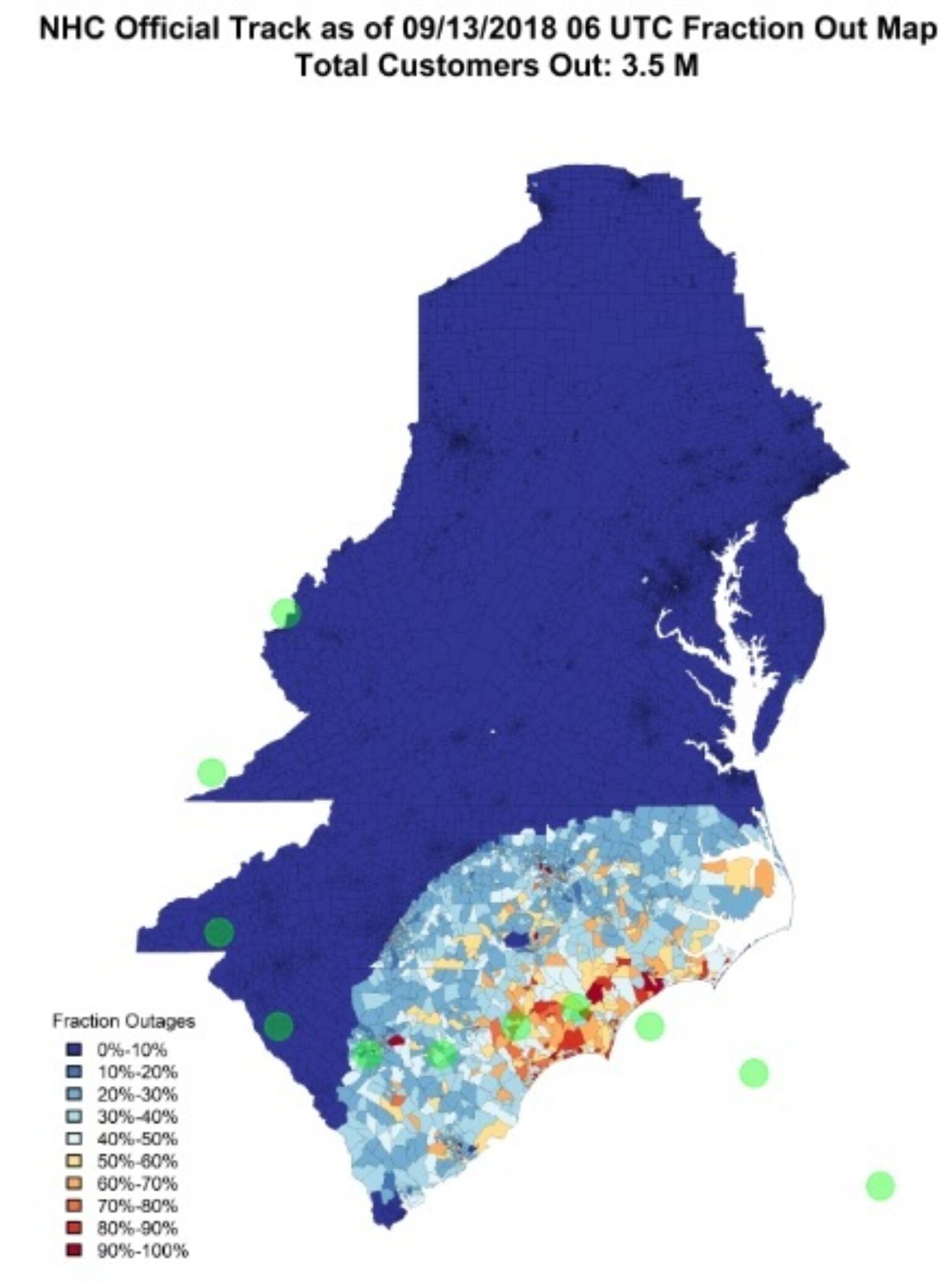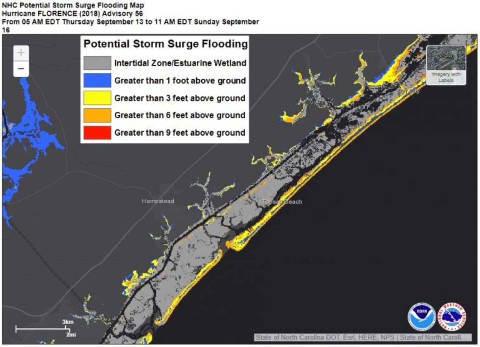 Hurricane Ike made landfall on the Texas coast 10 years ago this morning. It was only a strong Category 2 hurricane at landfall, but don't make the same mistake by judging Florence as only a Category 2 hurricane, as disastrous rainfall flooding and storm surge impacts are likely to occur. Based on the NHC storm surge inundation forecast, the storm surge is expected to be between 9 and 13 feet from Cape Fear to Cape Lookout, NC, where the natural concave shape of the coastline will enhance the surge. It appears that the surge will come ashore just after high tide tomorrow, which occurs around 11:30 p.m. tonight with low tide occurring at 5:00 a.m. tomorrow.