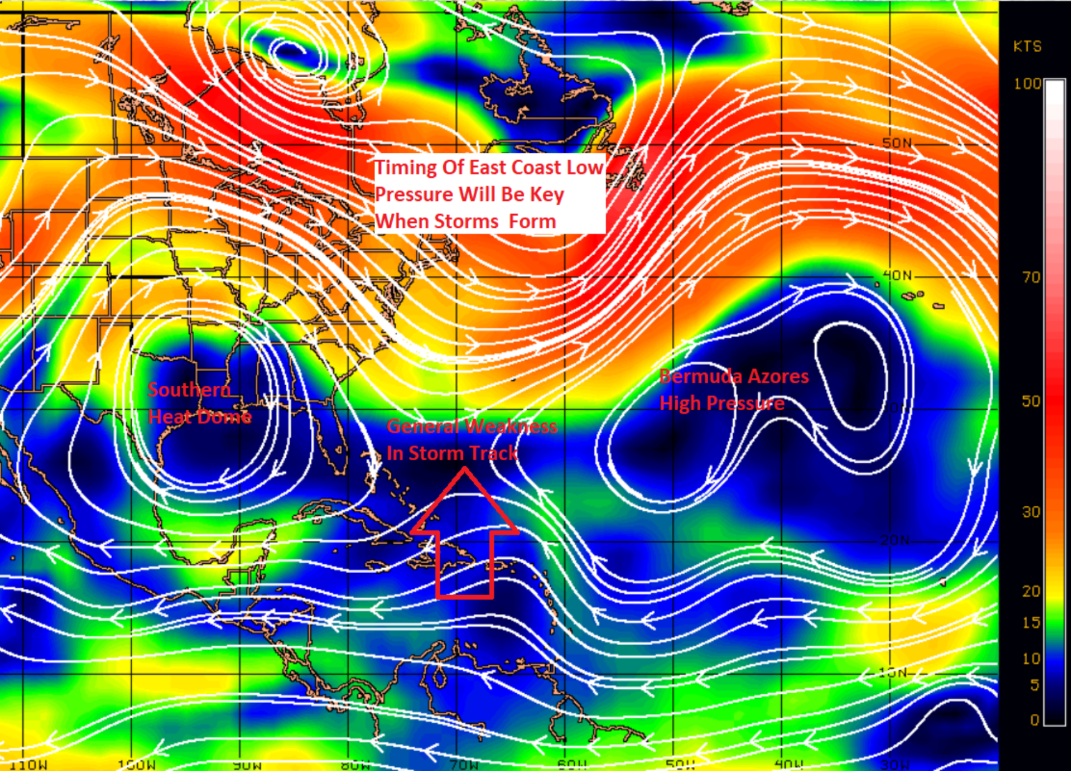 By now you may have seen the various updated Atlantic hurricane season forecasts, which, for the most part, continue to call for above-normal activity. As I have stated several times, the overall number is not what is important, but, rather, the steering currents that influence the track(s). Contrary to popular belief, however, most named storms have fairly regular and well-defined tracks because of the location and orientation of the Bermuda Azores high pressure, which ultimately determines the tracks of most named storms. The difficulty in predicting a storm track occurs either when the typical climatological steering wind flow is replaced by a less common, large-scale flow or, even more importantly, when rapid changes occur in the strength and orientation of the steering current, such as a bypassing mid-latitude trough, which is really only well-forecasted 5 to 7 days in advance.
