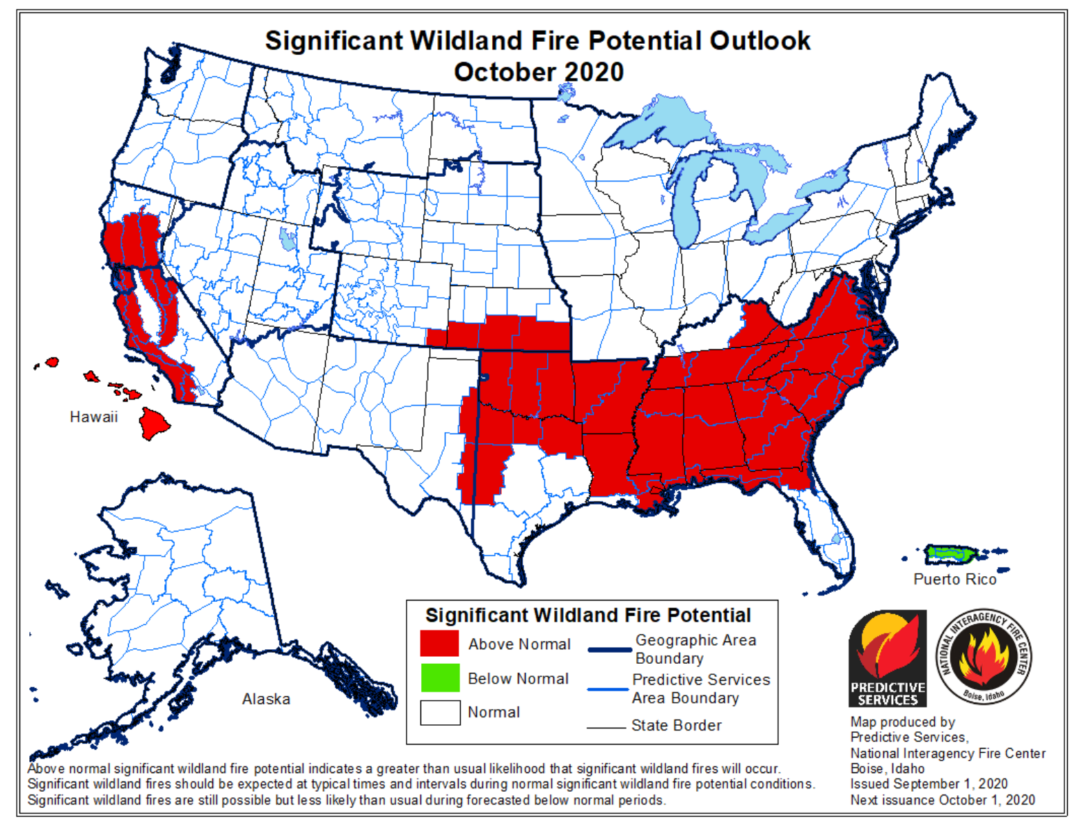 The short term forecast calls for a possible pattern change in the middle of October with maybe even some rain from the remnants of hurricane Marie in the East Pacific. However, in the longer-range The NIFC predicts an above-normal potential for “significant” wildfires in parts of California for the next two months. In November and December, the forecast predicts the risk will return to normal for Northern California but will remain above normal for coastal California from Santa Barbara south to the Mexican border. The forecast also makes mention of the fact that the La Niña weather pattern is expected to bring above-normal temperatures and Santa Ana winds to Southern California in November and December. This will heighten the potential for large wildfires, so the insurance industry should likely expect more wildfire loss events over the next couple of months.
