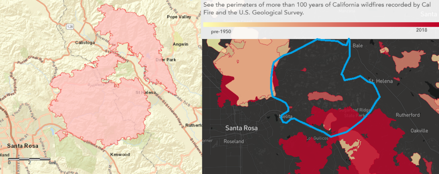 To illustrate the point consider the recent Glass Fire that occurred just east of Santa Rosa, California that has already burned 61 structures. BMS iVision shows the updated National Interagency Fire Center (NIFC) Glass Fire wildfire perimeter. If you compare that with the historical wildfire perimeters then you will see the current wildfire area has not burned in the last 50 years. So sure, fire conditions were extreme due to weather, but the fact that this area has not seen a fire in 50 years is the real reason why it burned so fast towards East Santa Rosa in the early morning hours of September 28th.