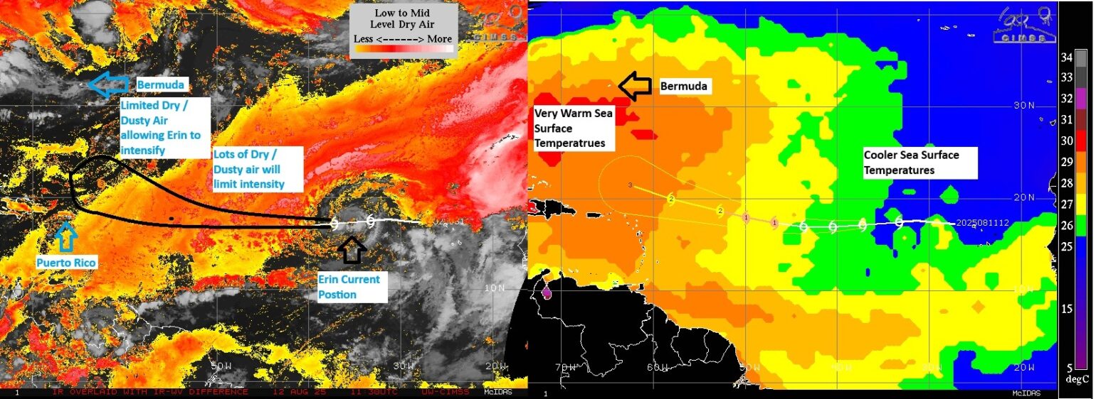 Over the next few days, Erin will struggle with intensity. There is a lot of dry/dusty air around Erin, as you can see from the image below. On top of this, the overall sea surface temperature (SST) environment is marginal at best. However, as Erin approaches 50°W longitude, the dry dusty air abates and the SST warms, and this allows Erin to strengthen. It is at this time that Erin could become a major hurricane. As mentioned in the track section, Erin is being steered by an elongated ridge of high pressure. In a few days, a weakness develops in the western part of the ridge, allowing Erin to turn north between higher pressure to the east and higher pressure centered across the Central U.S. It is at this time that Erin becomes a significant hurricane, adding to the seasonal ACE. Fueling Erin will be some of the warmest waters of the Atlantic Basin, which will only further intensify its strength in the long-range forecast, so don’t be surprised if Erin achieves Category 4 status or higher as it approaches the western part of the Atlantic basin near Bermuda or off the East Coast of the U.S.