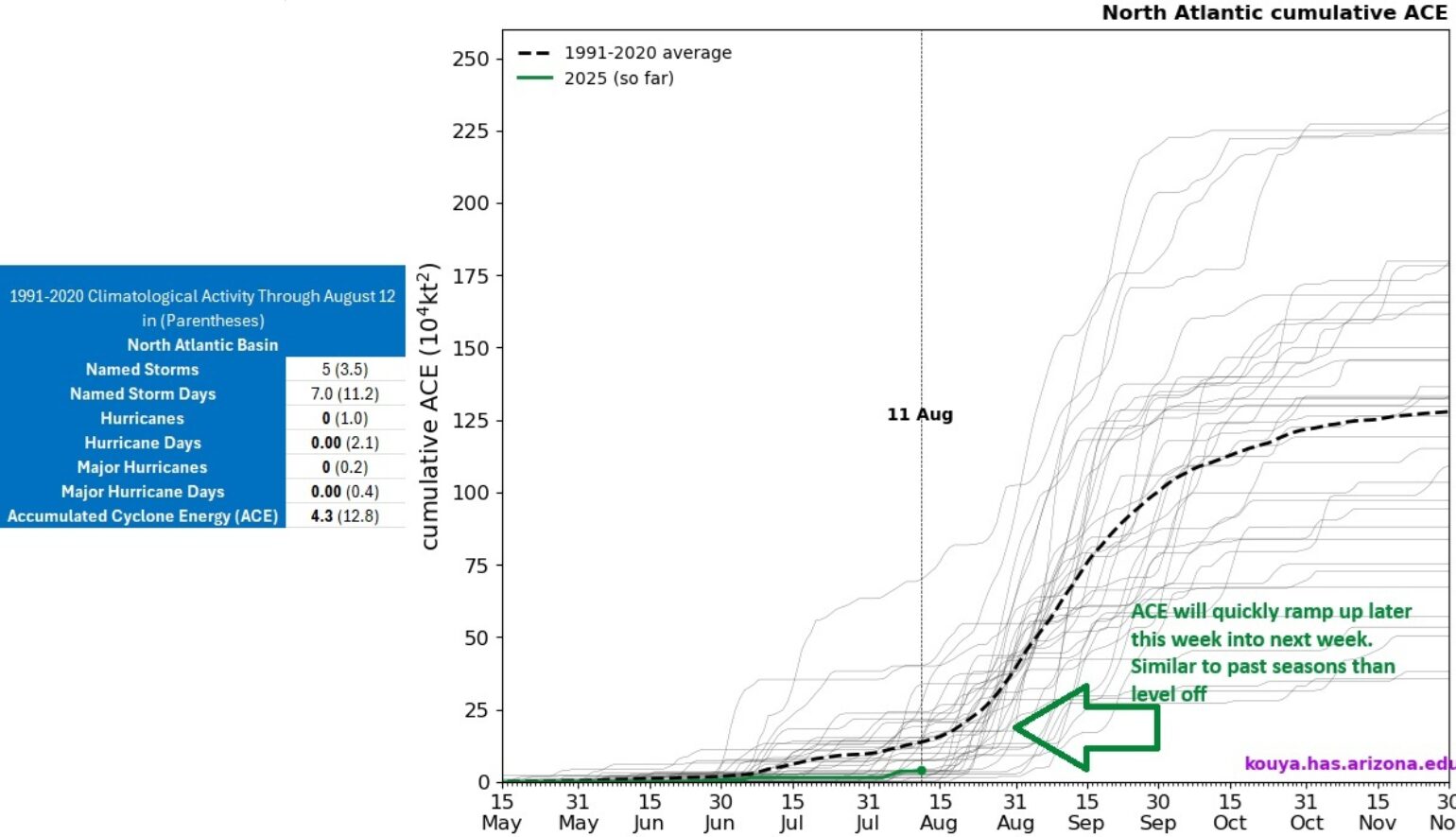 Below is a table and chart of the Atlantic Hurricane Season as of August 12 (averages in Parentheses). As mentioned, the four named storms before Erin have been relatively short-lived and weak, resulting in only 3.7 units of Accumulated Cyclone Energy (ACE).
