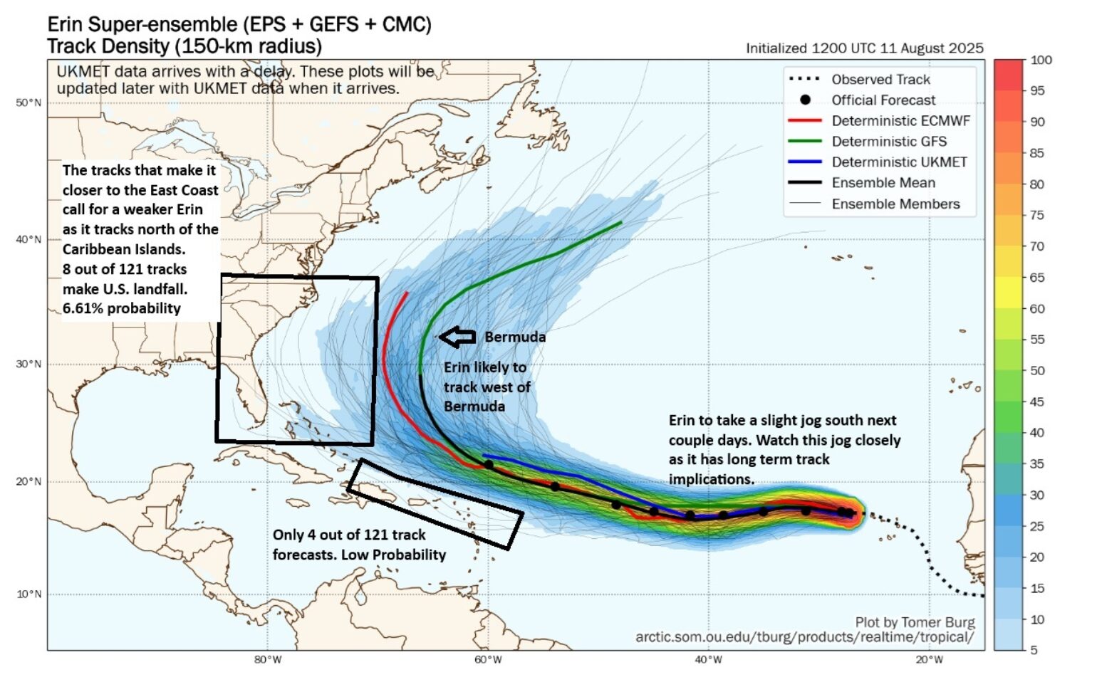 The plot above shows that Erin will continue on a westward track with perhaps a slight southwest jog until about 50°W longitude as it travels the southern edge of the ridge of high pressure known as the Bermuda-Azore High. This jog southwest could be very important in the future track and intensity of Erin. A more southern track would be weaker, allowing Erin to track further west towards the islands and the U.S. East Coast. Around Thursday, Erin will start to track in a more northwest direction above the Caribbean islands. Right now, there is less than a 5% chance of Erin tracking near the Caribbean islands. The current suggestion is that Bermuda has the highest probability of seeing an impactful storm, with Erin likely tracking west of the island. However, this should not be a surprise, as our preseason forecast suggested Bermuda would be a target for this season. Bermuda has also had a string of impactful seasons, such as Ernesto 2024 just last season and Paulette in 2020, which is amazing for a 20-square-mile island in the large Atlantic Ocean. Of course, as one of the world's insurance hubs, the island is built to withstand hurricanes, having endured a long legacy of impacts; the nation has tight building codes that allow the small island nation to build for hurricane impacts. Hopefully, other parts of the insurance industry are taking note and see this type of resilience continue to take shape along the U.S. coastline.