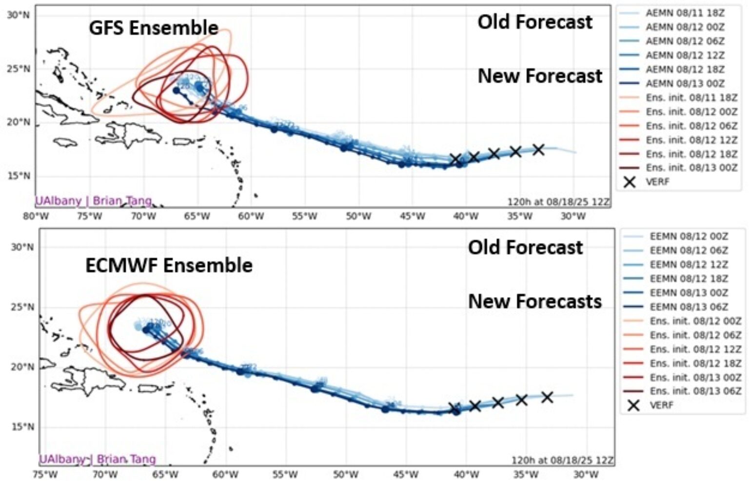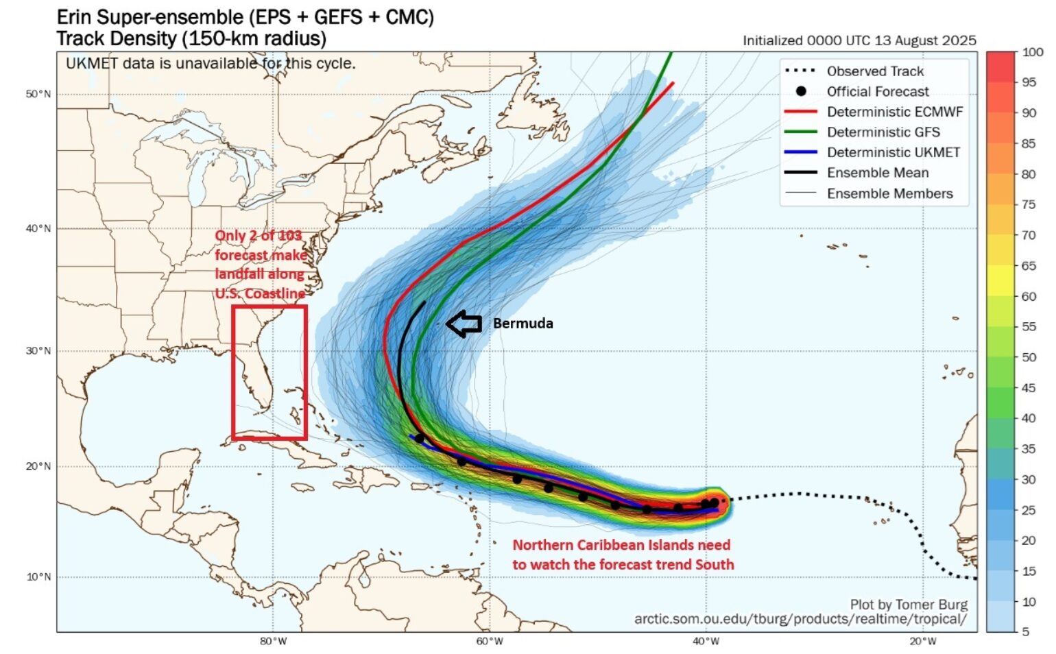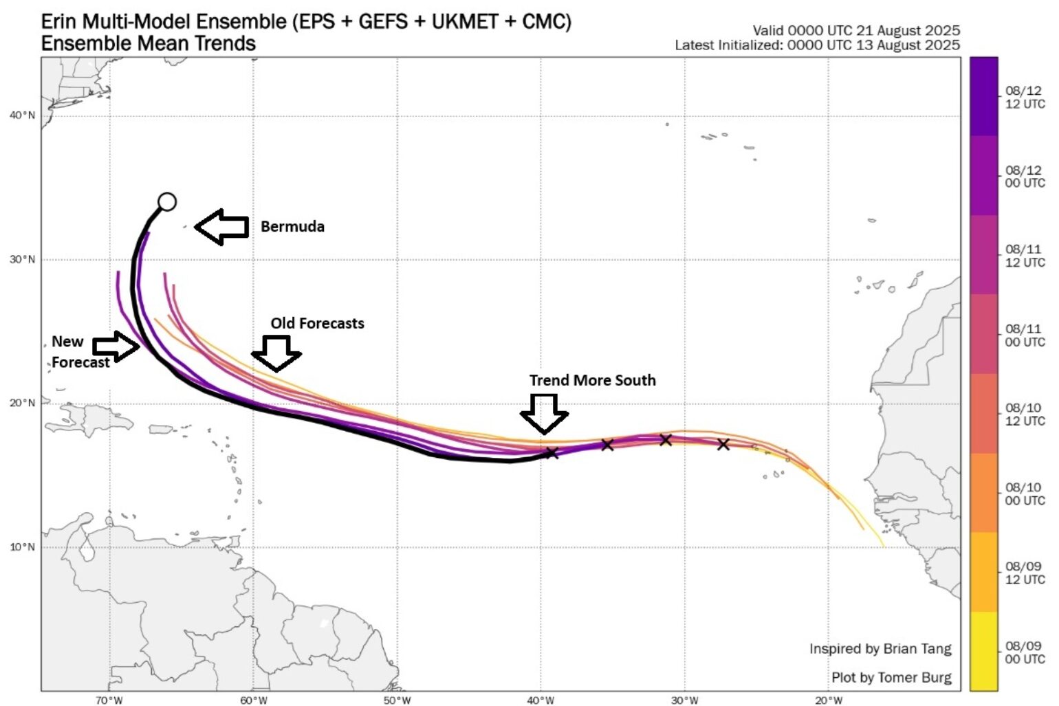 Yesterday we also discussed how using the super ensemble product by Tomer Burg at the University of Oklahoma can also provide helpful information. One can also view the trend in these extra-long range forecasts, which show in the short term Erin is tracking a bit further south than what was originally expected, resulting in an overall shift westward in the long-range forecast - with Erin now tracking west of Bermuda compared to earlier estimates. The newer forecasts are a darker color (purple), and the older forecasts are a lighter color (yellow)
