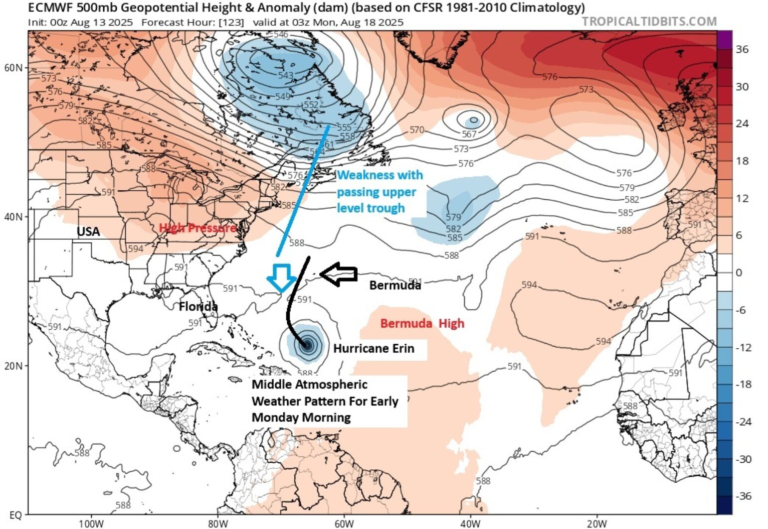The key messages are that the Caribbean should monitor any further shift in track to the south, as this could result in minor impacts to the northern islands like the U.S. Virgin Islands. At this time, the Bahamas and Southeastern U.S. still need to monitor Erin for any changes. Still, right now, overall landfall and bypassing impacts seem to be off the table, with rough surf being the only expected impact. Bermuda needs to pay close attention, but overall, Erin should track just to the west of the Island. We are still discussing long-range forecasts, and the uncertainty can be high. However, there is nothing in the overall weather pattern that appears to complicate the long-term steering flow of Erin's future track and the expected increase in intensity in the long-range forecast.