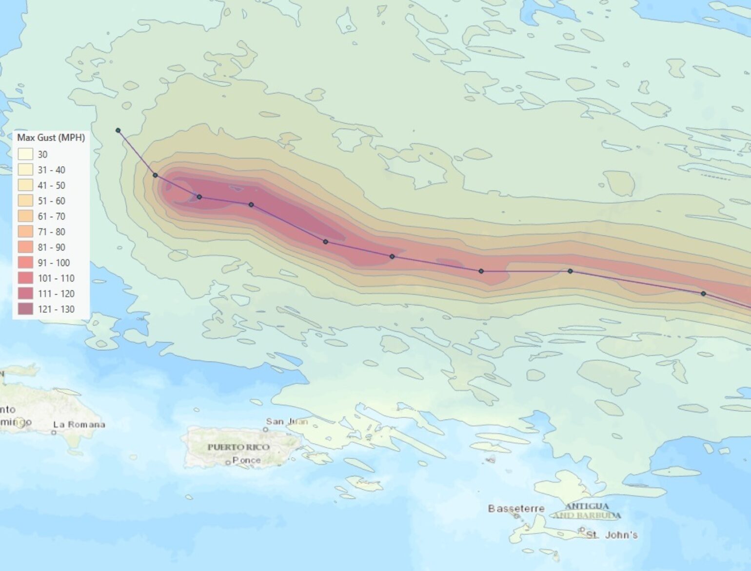 Above is the latest BMS Verisk Respond Max 3-second wind gust, showing limited impacts at this time to the Caribbean islands. However, any further shift in Erin's track needs to be closely monitored, as stronger wind gusts could approach the Islands.