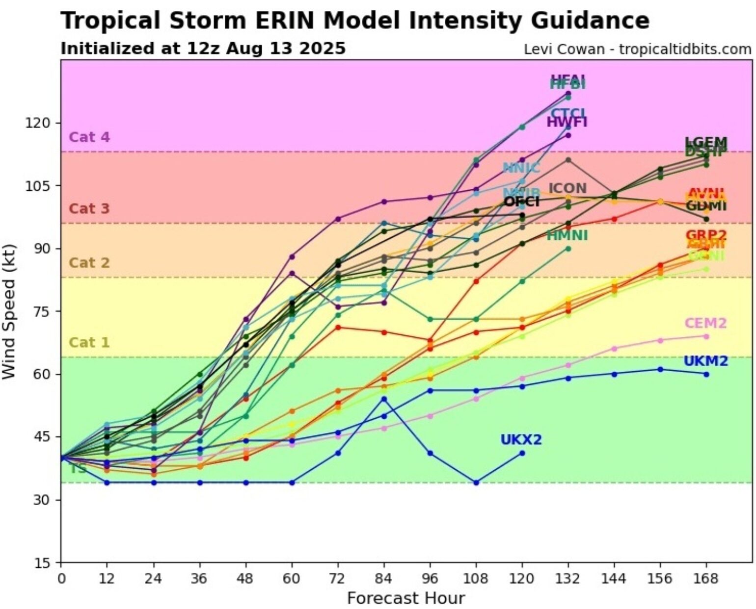 The intensity forecast depends on many factors, as usual. Erin is outrunning the dry dusty air and will move over very warm water. This will allow Erin to strengthen into the Atlantic Basin's first hurricane and major hurricane, and one can’t rule out that Erin might even reach a Category 4 hurricane briefly during its life cycle over the next week. So although Erin might look weak with limited convection, Erin will become a mature hurricane by this weekend as it approaches Bermuda later next week.