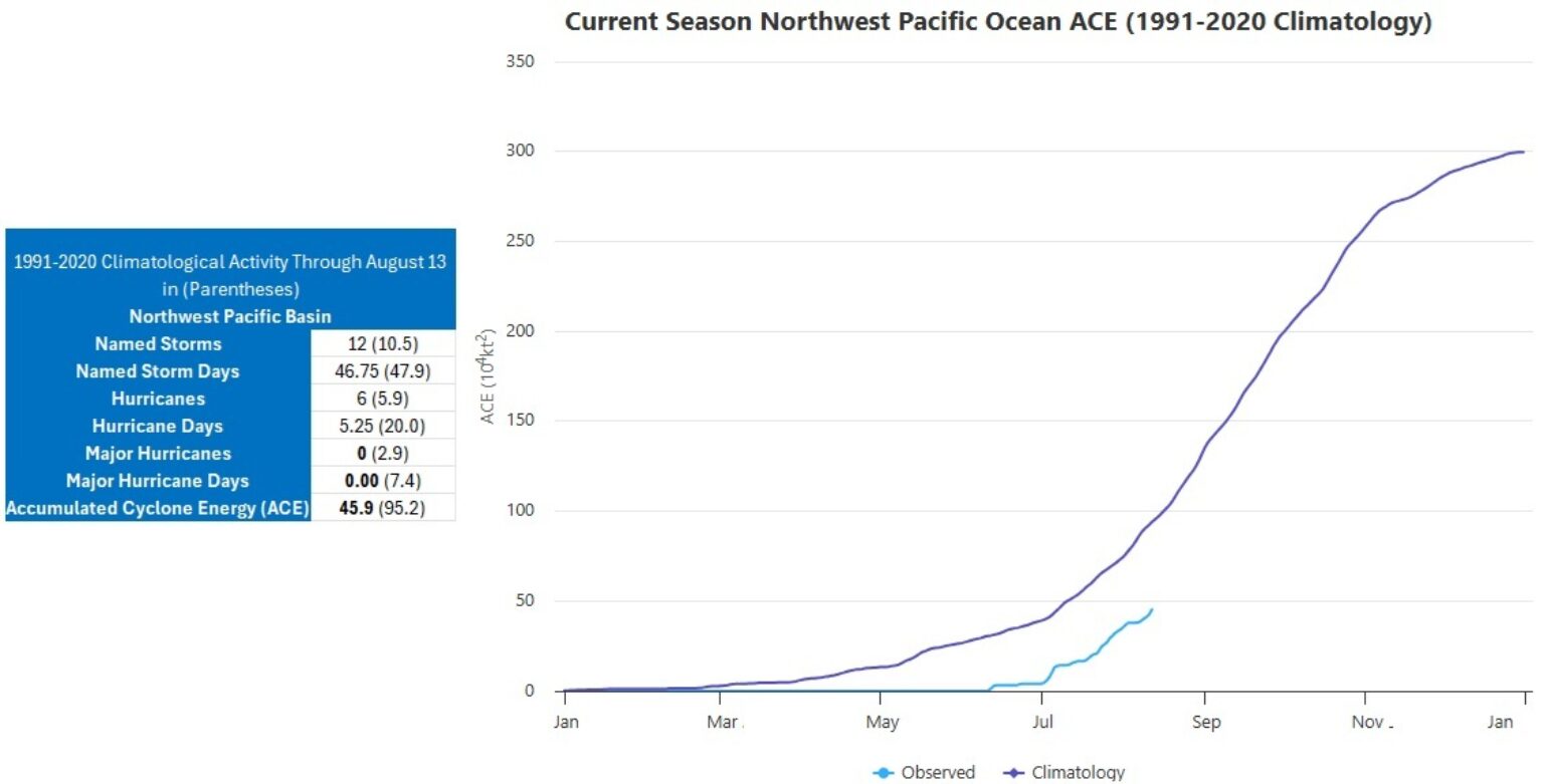 Today's BMS Tropical update will build upon the ideas outlined in yesterday's BMS Tropical Update on the future track and intensity of Tropical Storm Erin. But first, let's discuss a topic that may also interest the broader insurance industry, given that Typhoon Padul made landfall on Taiwan as a Category 2 hurricane over the last 24 hours. It is now forecast to make landfall along Fujian Province, which will add to the impacts, affecting approximately 43 million people within its path. In general, insurance impacts from Padul will likely be low, illustrating the potential protection gap that exists in other parts of the world. In general, the West Pacific Basin has been average in most metrics. Still, the basin has yet to have a major hurricane, which has likely resulted in a lower Accumulated Cyclone Energy (ACE) for the season to date.