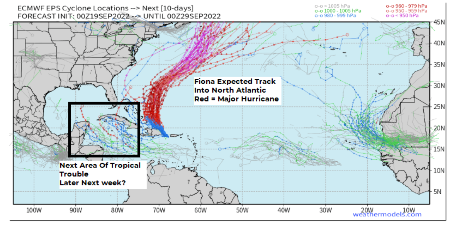 After Fiona exits the North Atlantic as a powerful extratropical storm, possibly impacting Newfoundland, Canada, the next area of tropical trouble is currently in hostile condition in the Main Development Region near 45 degrees west. It certainly is not much to look at right now, and the NHC does not even have it highlighted as an area of concern. Still, some long-range forecast ensemble models suggest it could be a feature to watch in the Caribbean after it clears through an area of stronger wind shear from Hurricane Fiona. The next name storm on the list is Gaston, and hopefully, this name does not live up to the bad reputation of the fictional character from Beauty and the Beast. However, anything that tracks into the Western Caribbean must be watched, given the climatological peak landfall risk for parts of the Florida Panhandle and west coast of Florida is late September into early October. If something develops out of this tropical wave, it is still five days from entering the Caribbean sea and 10 – 12 day from any possible concern to points west and north.