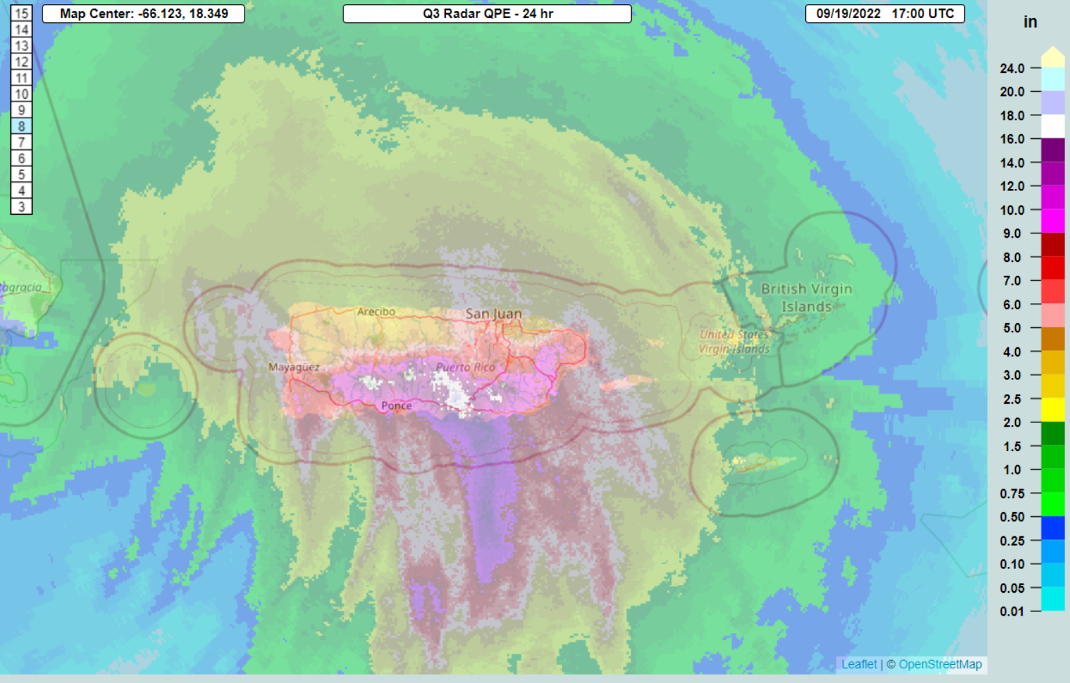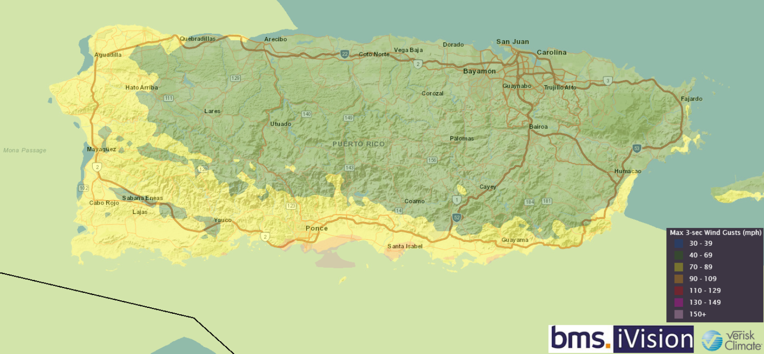 Above is the BMS iVision 3-second wind swath that allows BMS clients to get high-resolution wind impacts on their portfolio of risks. The wind swath shows that the coastal sections and populated town of Ponce, Puerto Rico, along the south-central coastline, had the highest wind gusts as Fiona took a left turn along the southern coast. Much of Puerto Rico is without power, but it should be noted that the overall power system was very fragile before Fiona’s impact. Still, these outages will raise concerns about Fiona’s widespread effects on the insurance industry.
