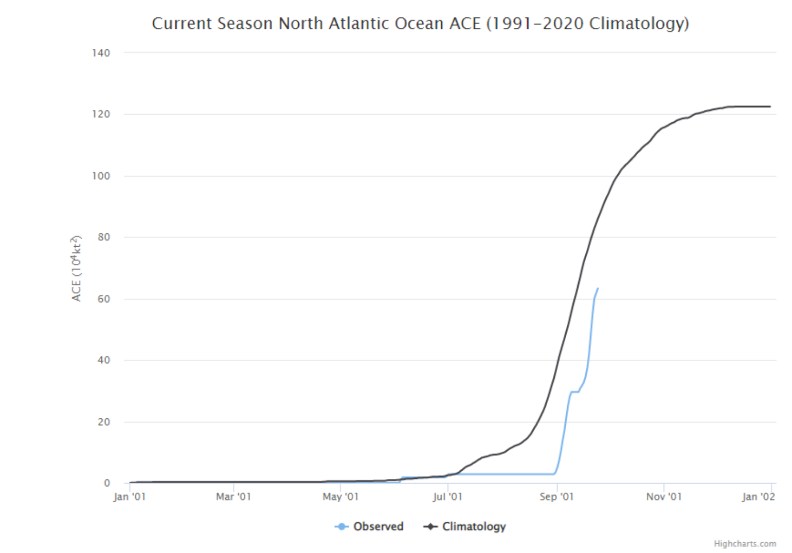 After leaving the African coastline 11 days ago as a tropical wave, with much anticipation, early this morning, Ian has become the 4th hurricane of the 2022 Atlantic season with winds of 75 mph. According to Phil Klotzbach at Colorado State University, only six other years since 1990 have had four plus Atlantic hurricanes form between September 2nd – 26th, showing how quickly the season went from record low activity to near normal activity in terms of Accumulated Cyclone Energy (ACE).
