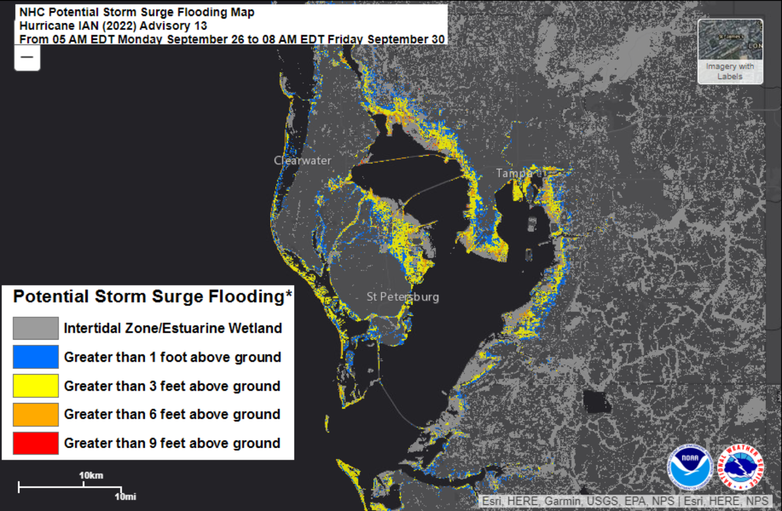 The NHC will be providing detailed storm surge forecasts as Ian approaches Florida. Currently, many areas in Tampa Bay will already be under three feet of water with as much as six feet in some localized areas.
