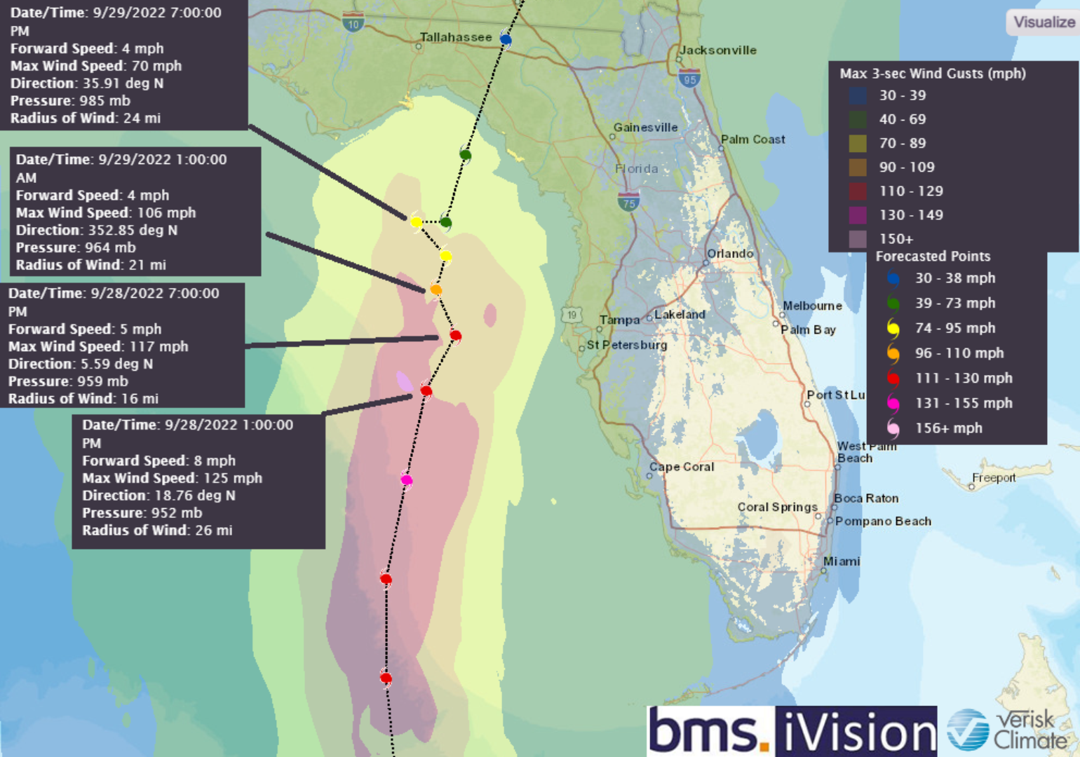 BMS iVision above that uses the Verisk Respond product continues to show a track just enough offshore to limit some significant impacts to the Tampa Bay Area. It also shows the rapid weakening and slowing as Ian tracks north. This is just one model scenario. The ECMWF model is much closer to landfall near Tampa Bay, resulting in a completely different loss outcome than the BMS iVision respond product suggests.