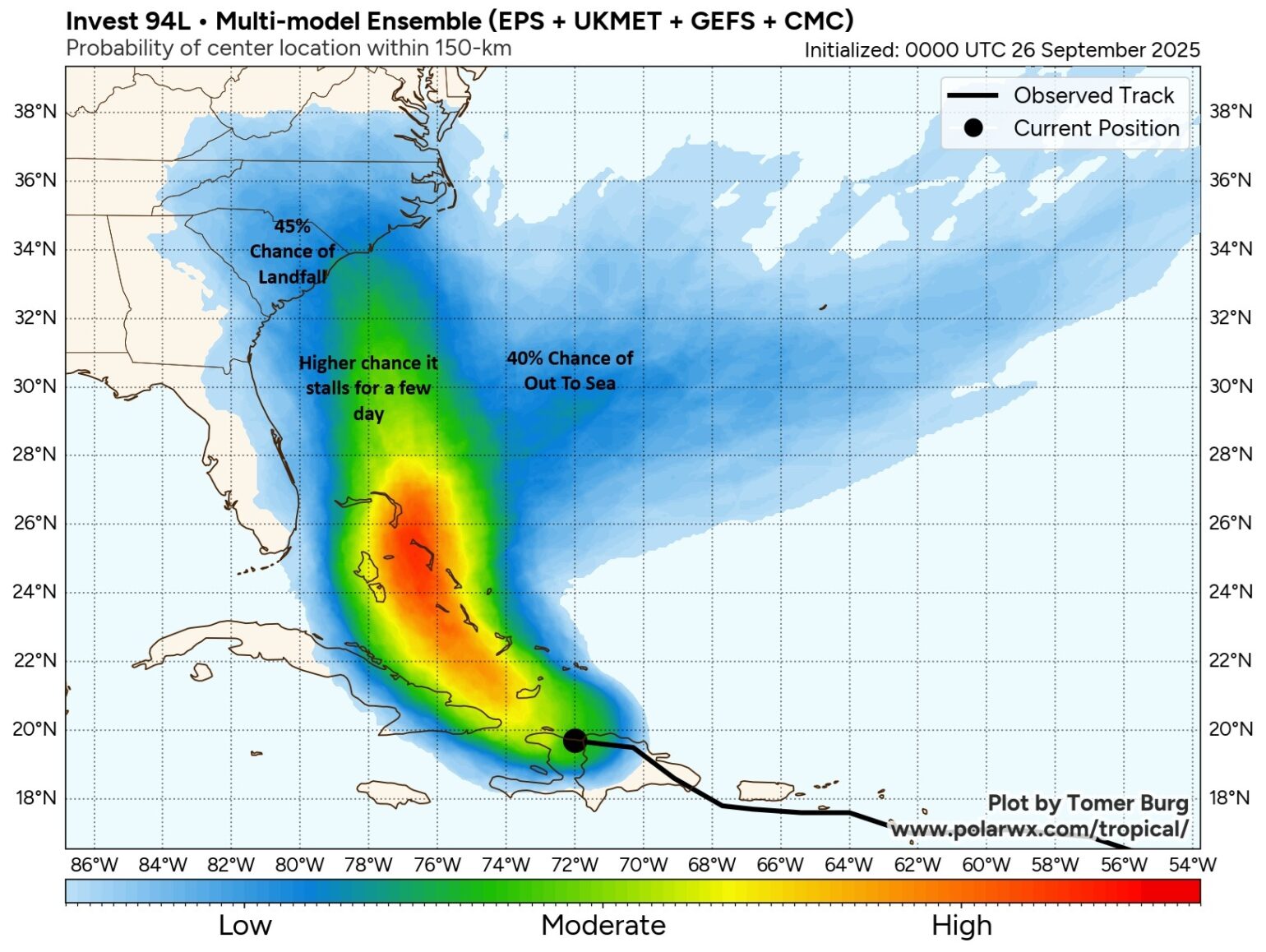 In the last BMS Tropical Update, we discussed the compacted forecast for Invest 93, now known as Humberto, and Invest 94L. Due to Humberto's quicker development, there is more certainty surrounding its overall endgame. Like the other two hurricanes this season, Erin and Gabrielle, Humberto is also expected to become a major hurricane, likely Category 4, following a similar path to Erin earlier this year, but maybe slightly closer to Bermuda. In fact, there is a high likelihood of rapid intensification due to low wind shear and warm ocean temperatures over the next few days. Humbert could pose a threat to Bermuda sometime early to the middle of next week, as Bermuda is located within the NHC cone of uncertainty. Remember, the NHC forecast cone is based on the previous 5 years, with an average error of 213 miles in a 5-day forecast. The multi-model ensemble suggests a 55% chance that Humberto will track within 100 miles of Bermuda. As Humberto is expected to be located near Bermuda next week, it will likely be a Category 3 hurricane, but in a weakening state. Any crazy forecast that you might have seen earlier in the week, suggesting it might merge with Invest 94L or loop back around to the U.S. Coastline, seems to be off the table at this time.
