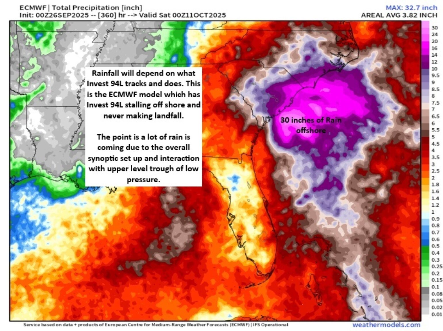 Perhaps the most significant issue, not uncommon with Named Storms, is that water is the new wind, posing a serious threat of heavy rain given the potential for Imelda to stall for at least a few days near the coast. Similar to Hurricane Helene last year, a setup is in place that could lead to locally heavy rain over parts of the Southeast ahead of Invest 94L through this weekend.