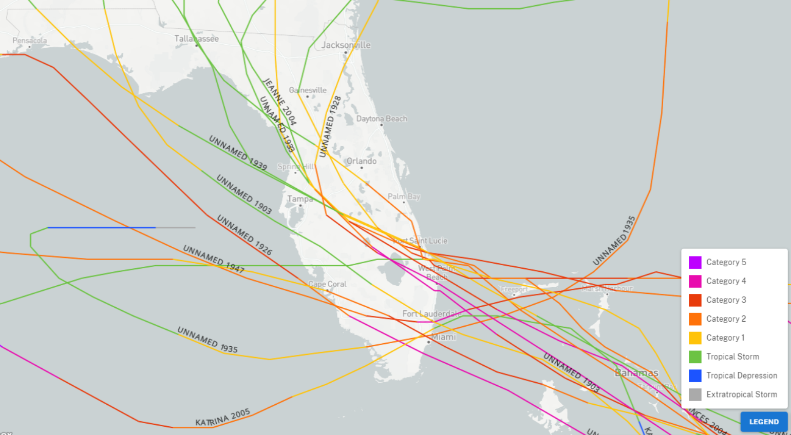 Interestingly, when we look at the hurricane history of landfalls between Miami and Port Saint Lucie, FL, it has been 17 years since this section of the coastline has had an impactful hurricane come in from the East. That hurricane was Katrina’s first U.S. landfall in 2005. This is pretty amazing, considering the changes along the coastline since 2005. Of course, the year before, Jeanne and Frances came in from the east as well. Since 1851, it seems only 15 hurricanes have taken similar tracks along this section of the coastline, so overall, one might even say it is fairly rare to get a hurricane making landfall from the east regardless of the month.