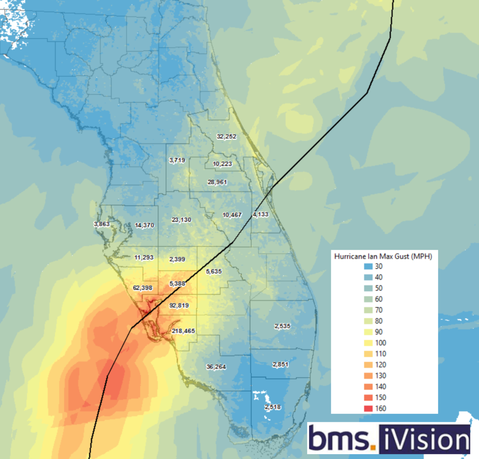 While details may change, overall storm surge, wind, and rain impacts are high, given Nicole’s forecast for East Central Florida. This is not an Ian-like situation, but the coastal flooding, in particular, will be nasty along Florida’s East Coast, which has not seen a direct hurricane landfall since 2005. One thing is certain when the wind blows in Florida, claims will result, and with the expected large wind field of tropical storm force winds, these claims could result over a large area. Let us take the example of Ian. Below is a plot of Ian’s maximum wind gust in MPH and the plot of the top 20 counties with claims reported to Florida OIR as of November 2nd. Notice a large number of claims far away from the landfall location. Especially in the counties of Orange (28K claims), Seminole (10.2K claims), and Volusia (32K claims), which experienced fairly low wind gusts of 60 – 70 mph. Note the claim in Palm Beach, Broward, and Miami-Dade that maybe experience 30 to 40 mph wind gusts.