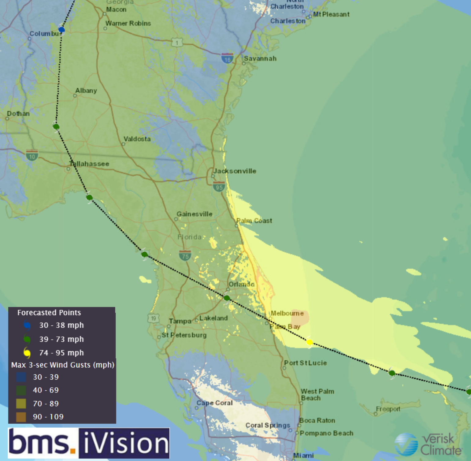 The image below of BMS iVision shows that the radius of maximum winds is about 35 miles before landfall. The extent of hurricane wind gusts will extend to the north (right side of the track) 80 miles. Overall, it is expected Nicole to be asymmetric in her approach to Florida. With a track like this, one could have rain and tropical-storm-force winds from Port St. Lucie to Jacksonville, but much of Miami and West Palm Beach would not even get much rain or wind. As a result, the overall track landfall location will be important as to what areas do not experience much impact to the south of the track, and the general trend has been to the north. So Melbourne to Dayton Beach landfall location appears to be part of the trend.