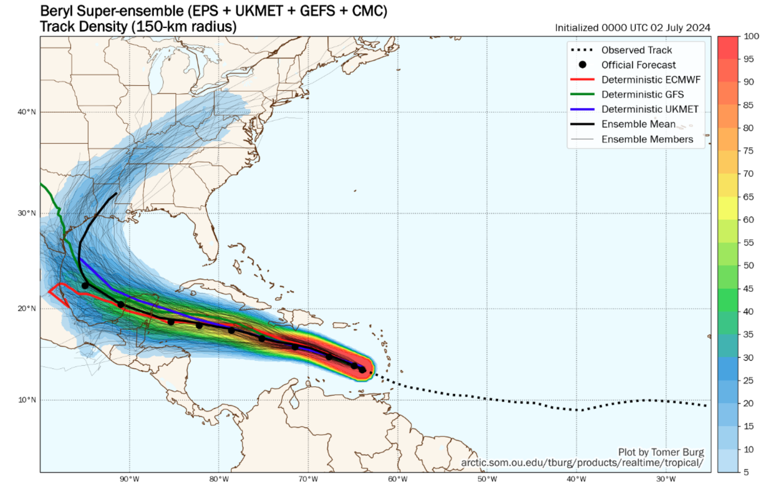 As we posted yesterday in our BMS Tropical Update, there was a possibility that Beryl would reach a Category 5 hurricane status, a feat it ended up achieving last night. Category 5 hurricanes in the Atlantic Basin, any time a month, are exceedingly rare having occurred only 41 other times since 1851. Our blog yesterday highlighted how we have much better observational capabilities now, and if you have not checked out any of Beryl’s satellite images, now would be a good time to see the classic structure of a Category 5 hurricane. Beryl winds are, however, intense, but the overall pressure of 938 mb makes it one of the highest pressures recorded for a Category 5 hurricane. As you might have read, research suggests pressure is a much better indicator of potential damage than the estimated wind speed. Thankfully, Beryl's extreme intensity is not impacting anything as it crosses the central Caribbean about 235 miles south of the Dominican Republic. In other words, there is little damage occurring now as it crosses very warm water as it reaches the theoretical Maximum Potential Intensity (MPI), which is something that happens extremely infrequently in the historical record. Yet, when the conditions are perfect like with Beryl, this is possible just as science says.
