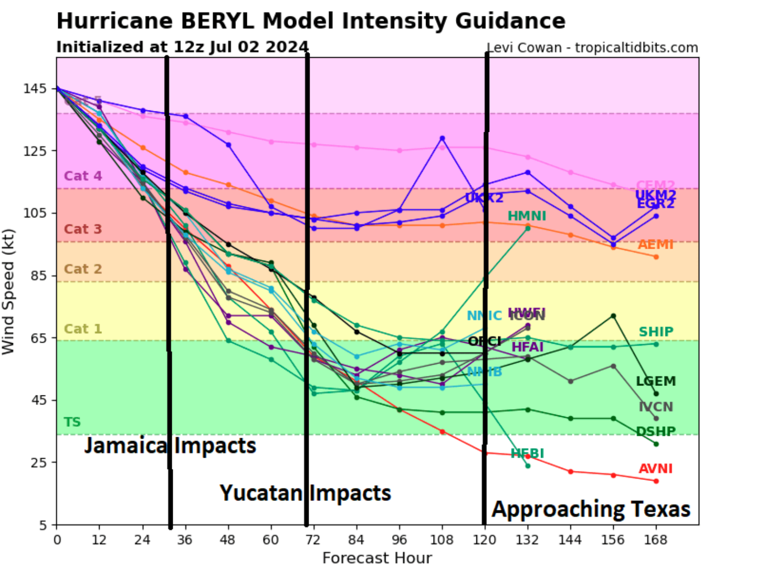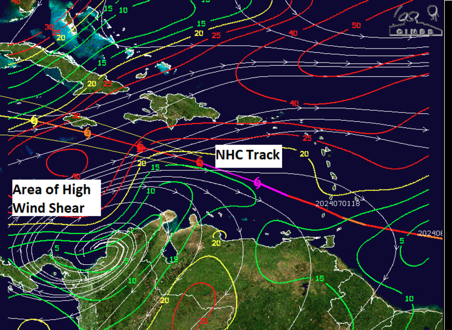 The good news is that the storm is expected to weaken, but the storm surge could be huge, and major hurricane conditions could still happen Wednesday into Thursday for this area. The NHC is not necessarily forecasting this, but Beryl could rapidly weaken as it approaches an area of 40 kts of wind shear just before Jamaica tomorrow.