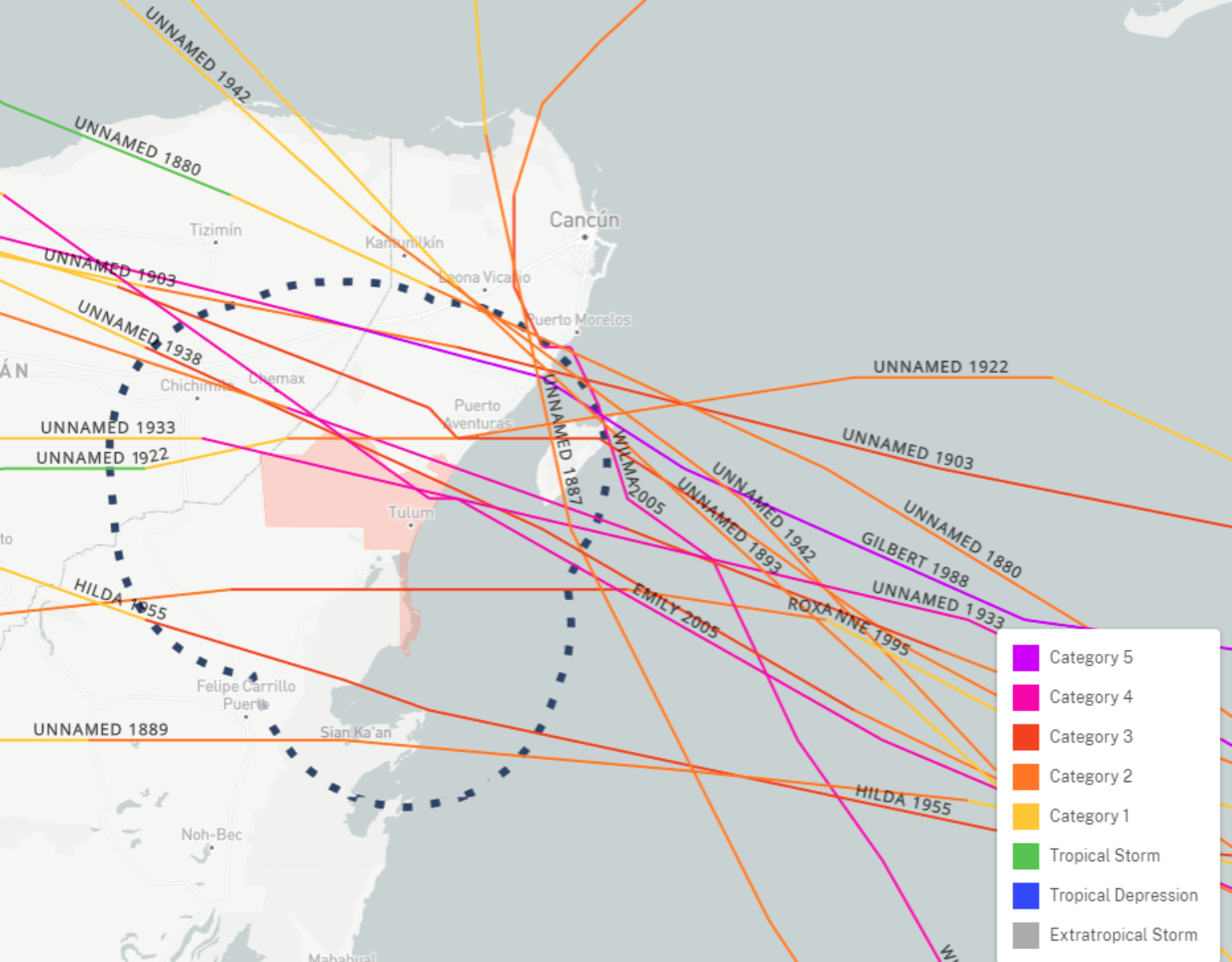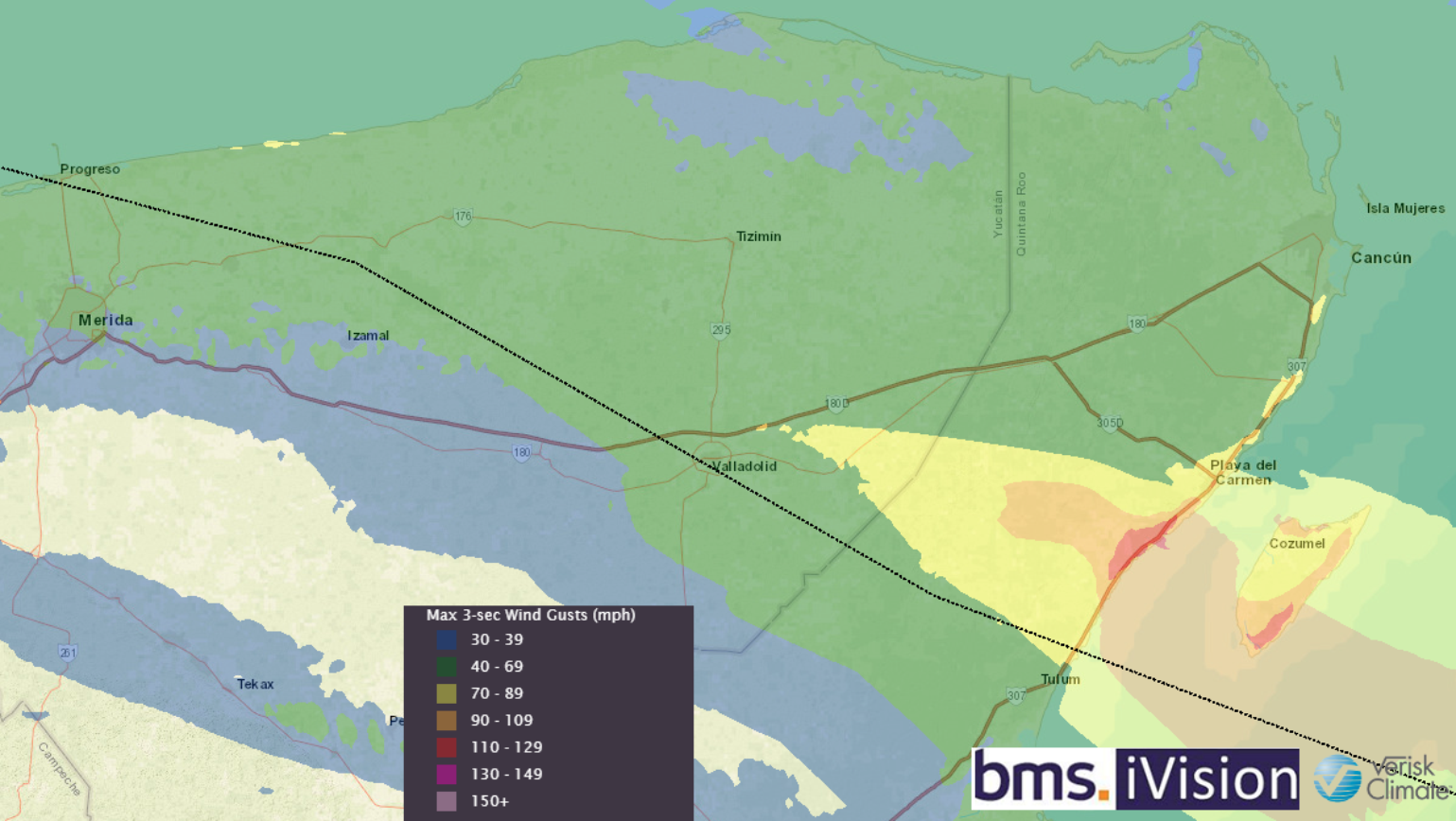 Beryl made landfall as a modest Category 2 hurricane. The last Category 2+ hurricane to make landfall within 30 miles of this location was Hurricane Wilma and Emily in 2005, but Emily was much closer to the path that Beryl took and much stronger. Given the overall structure of Beryl, it is a bit disjointed at landfall, and the Category 2 (110 mph) wind rating at landfall might be generous based on what the radar and satellite trends looked like at landfall. Beryl’s structure was likely influenced by some southern wind shear and ingested some dryer air from land, allowing for a lopsided structure, which means the highest impacts would be to the north of the storm, which might be unfortunate because this is where the majority of the exposure is north of Tulum with the many different beach resorts, including the staff, to support them.