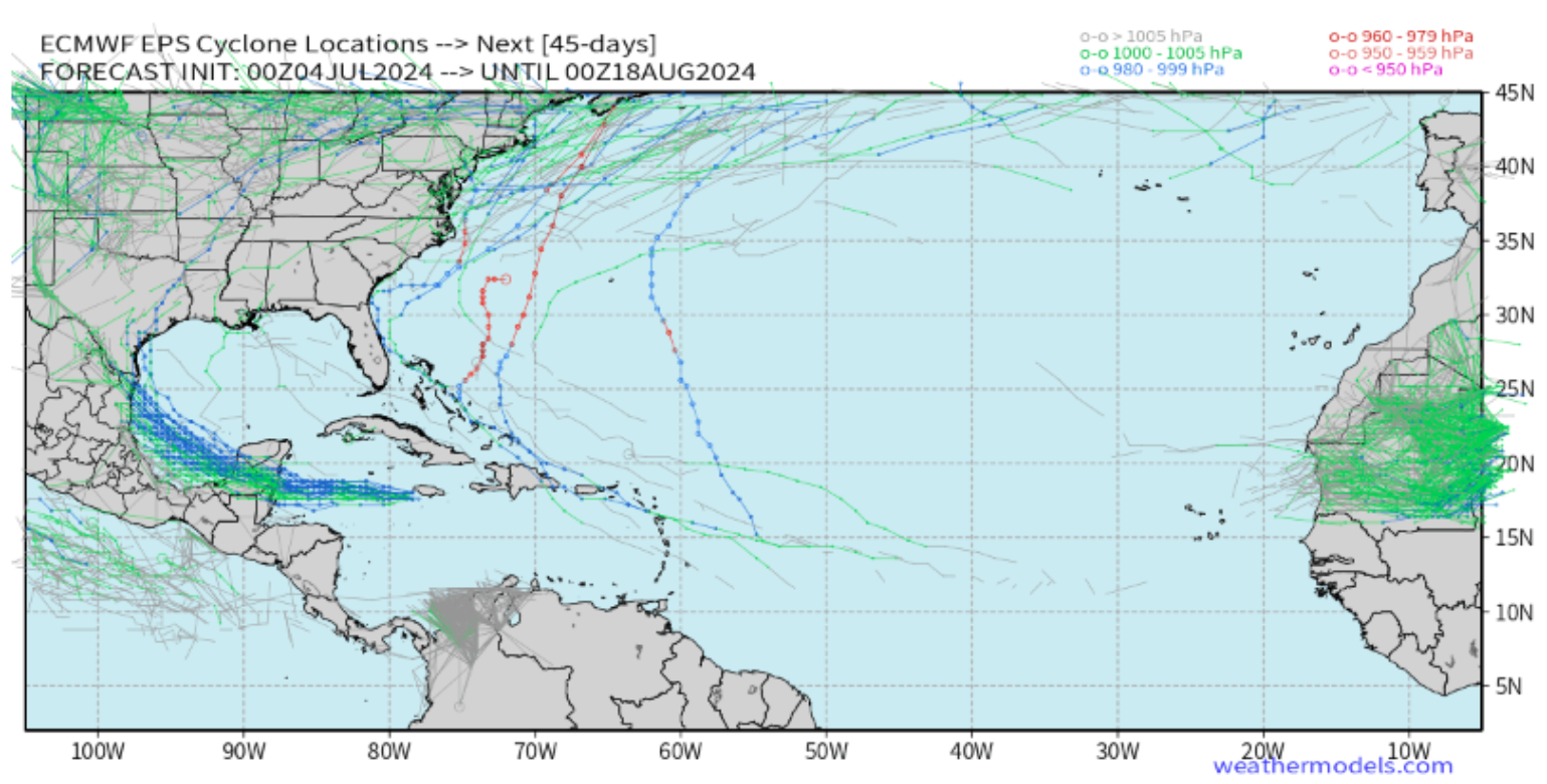 The latest ECMWF seasonal climate model guidance was released yesterday. It shows that the overall seasonal activity has been dialed back from 100% in June to now just 40% above average. The June forecast from the climate model had 11.3 hurricanes forming over the season, and now it is down to 8.4, with the average in a given season being 7.2. This is excellent news for the insurance industry, and yes, we have had a very active start due to one storm. So far, it appears that most of July will be quiet according to the ECMWF 45-day forecast, with just some subtle hints of activity into the start of August.