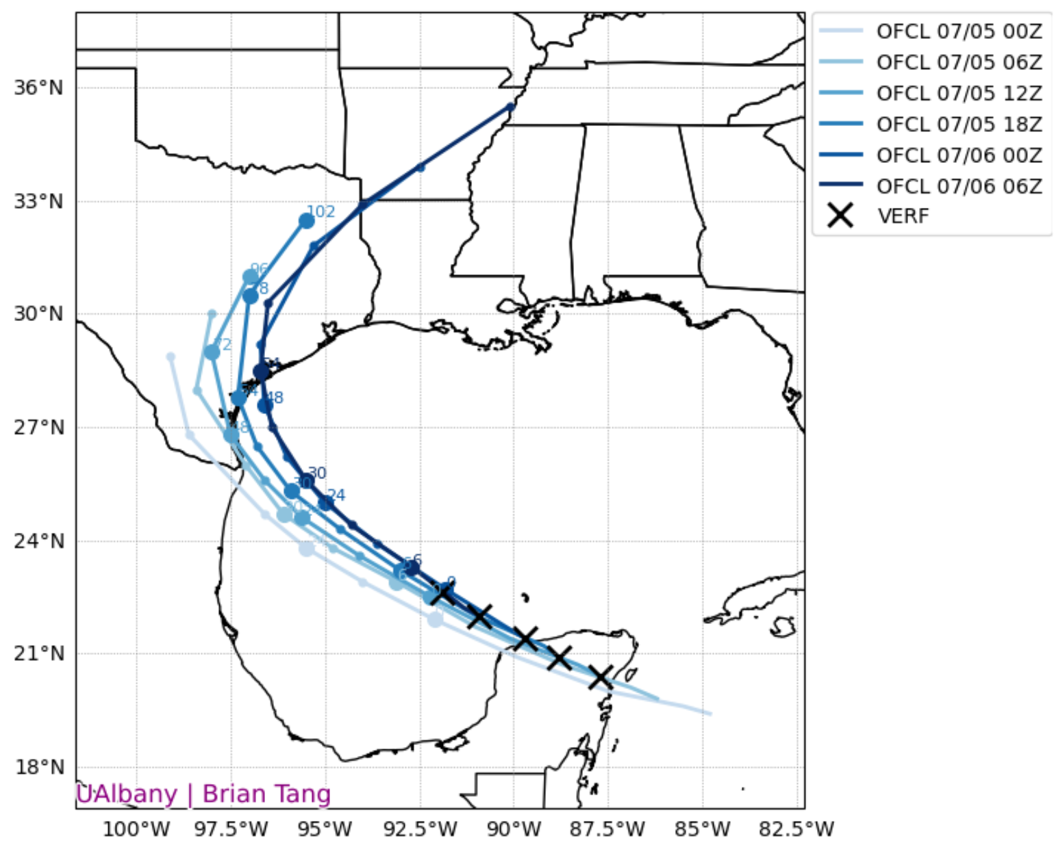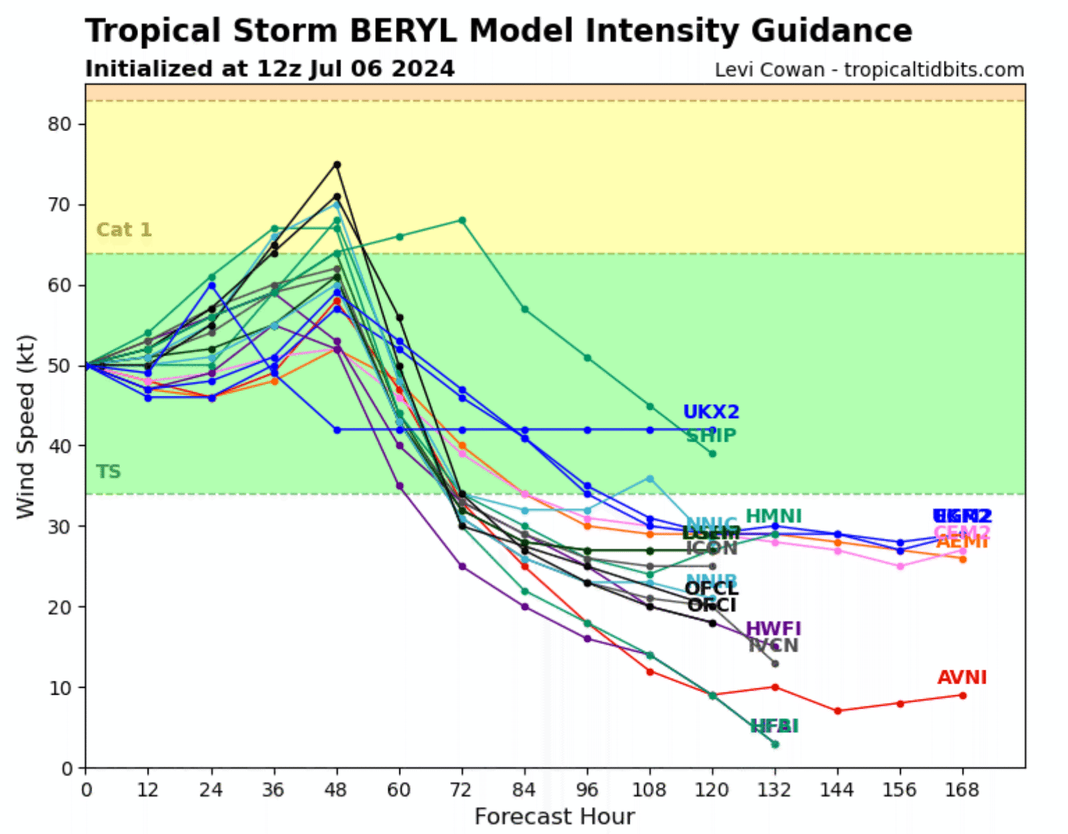 Over the last 24 hours, the various forecast models have been grappling with Beryl’s expected track and intensity, a common occurrence when the model is initialized with a weaker vortex. Yesterday, we noted how the upper Midwest was yearning for a taste of summer over July 4th as an upper-level trough had brought cool, rainy weather. This cool weather has now reached parts of North Texas, with temperatures in the 70s and even 60s in some areas, a rarity for Texas in July. It is this potent upper-level trough of low pressure that is pulling Beryl northward. This shift is now evident in the NHC official forecast track error, which had been very accurate up to the forecasted landfall of Beryl on the Yucatan. However, the skill of Beryl's end game has shifted from points south of Brownsville, Texas, to now Matagorda Island National Wildlife Refuge, a shift of nearly 250 miles up the coastline in just 24 hours. This significant shift means Beryl will have more time over the open, warm waters of the Gulf of Mexico, underscoring the significance of its movement.