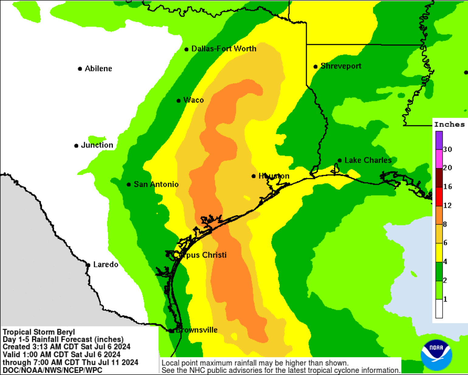 Other things to keep in mind regarding Beryl's impact are the storm surges we already talked about, but the other water risk will be flooding rainfall. This will not be a Harvey-type rainfall, but 8 to 12 inches of rain are forecasted along Beryl's path into Texas to the west of the I-35 corridor. This is concerning as much of the region has had a wet start to the summer. If you remember, far east Texas has a potential dam failure at Livingston Dam as the Trinity River Authority works to shore up repairs before Beryl’s rain comes.