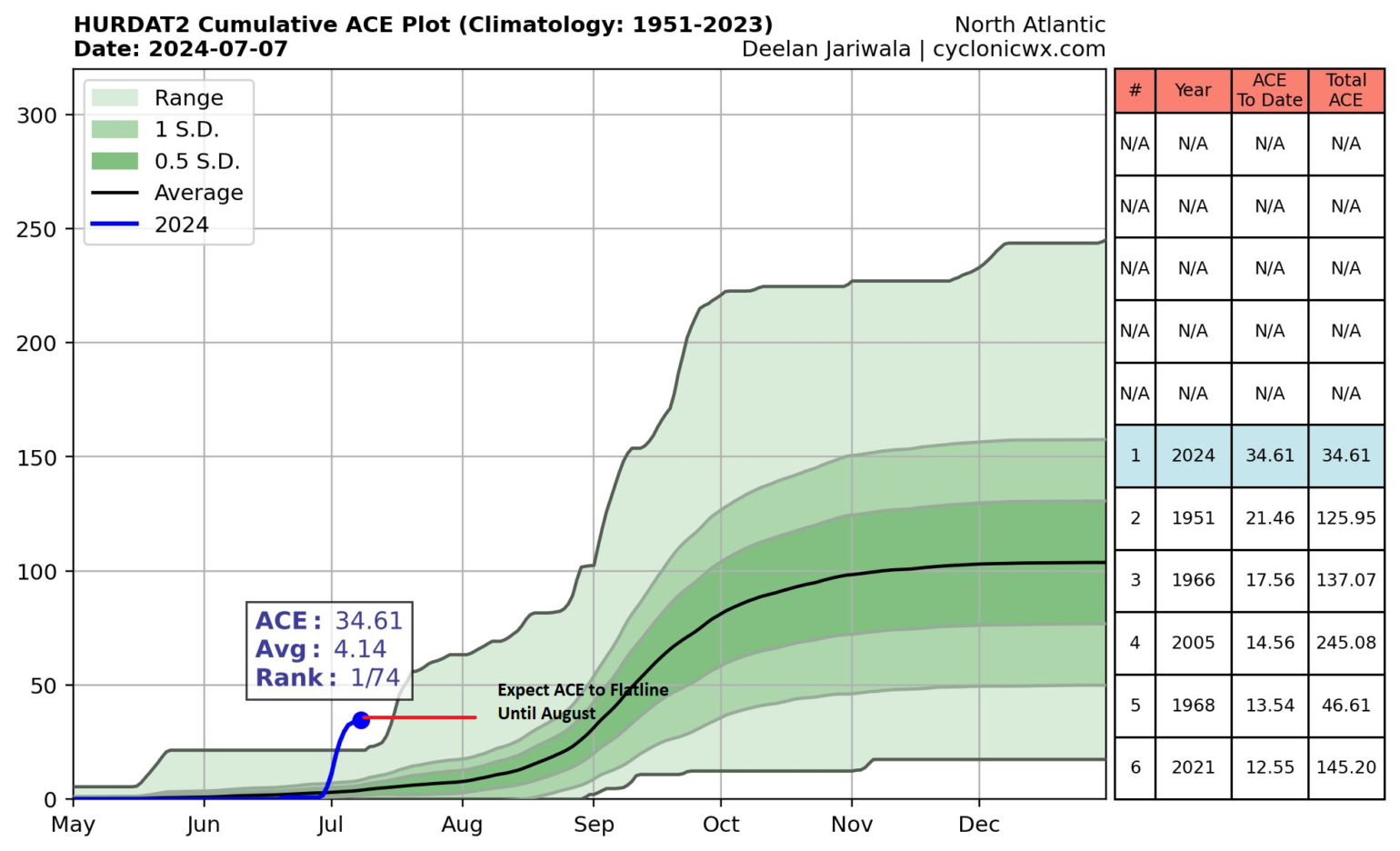 Through July 7th, the Atlantic has produced 34.61 units, the highest value ever observed for a year on record. However, very little new activity is expected in July. The ACE will flatline until the end of the month, which will still put it above normal for the season but out of record territory.