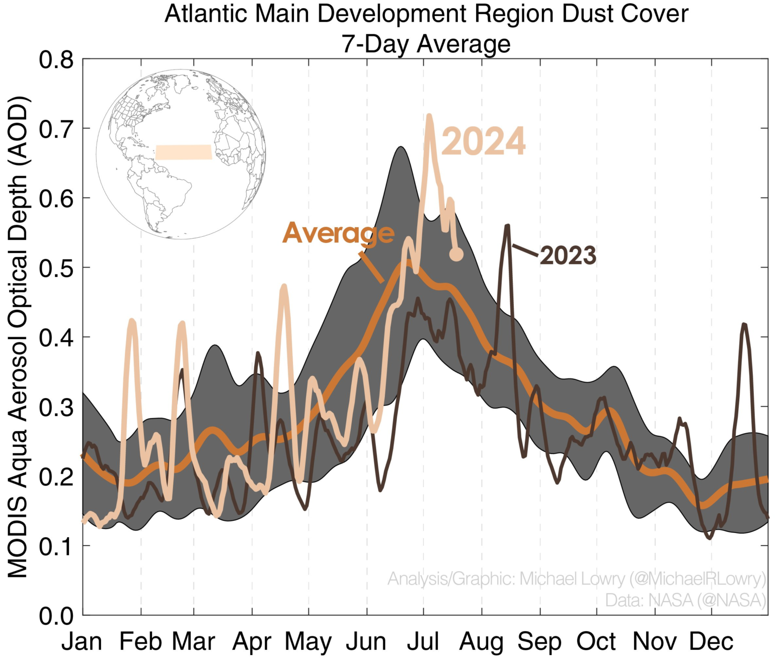 Another impacting factor observed this season has been the dry air associated with outbreaks of dust from the Sahara desert, suppressing new storms' growth. Beryl formed during a lull in dust activity. Recently, Michael Lowry, a Hurricane Specialist and Storm Surge Expert at WPLG Local 10 in Miami, did an analysis showing that the tropical North Atlantic has seen the second dustiest July since continuous satellite records began in 2002. Air quality has been especially poor off western Africa and over the Cabo Verde Islands.