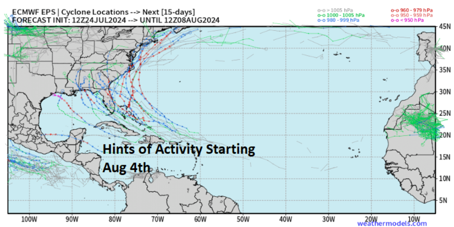 So, as the spring is loaded, almost every tropical wave now needs to be watched. A tropical wave over Western Africa needs to be monitored as it moves off the continent over the next 48 hours. The wave will emerge at a high latitude and bring rain and wind to portions of the Cabo Verde Islands. This tropical wave has the most long-range model support for future development in the 10 to 12-day period around August 3rd or 4th. The model support could easily flop, but a noticeable trend towards the development of some tropical features north of the Lesser Antilles and Puerto Rico is increasing slightly, it seems, with every model run.