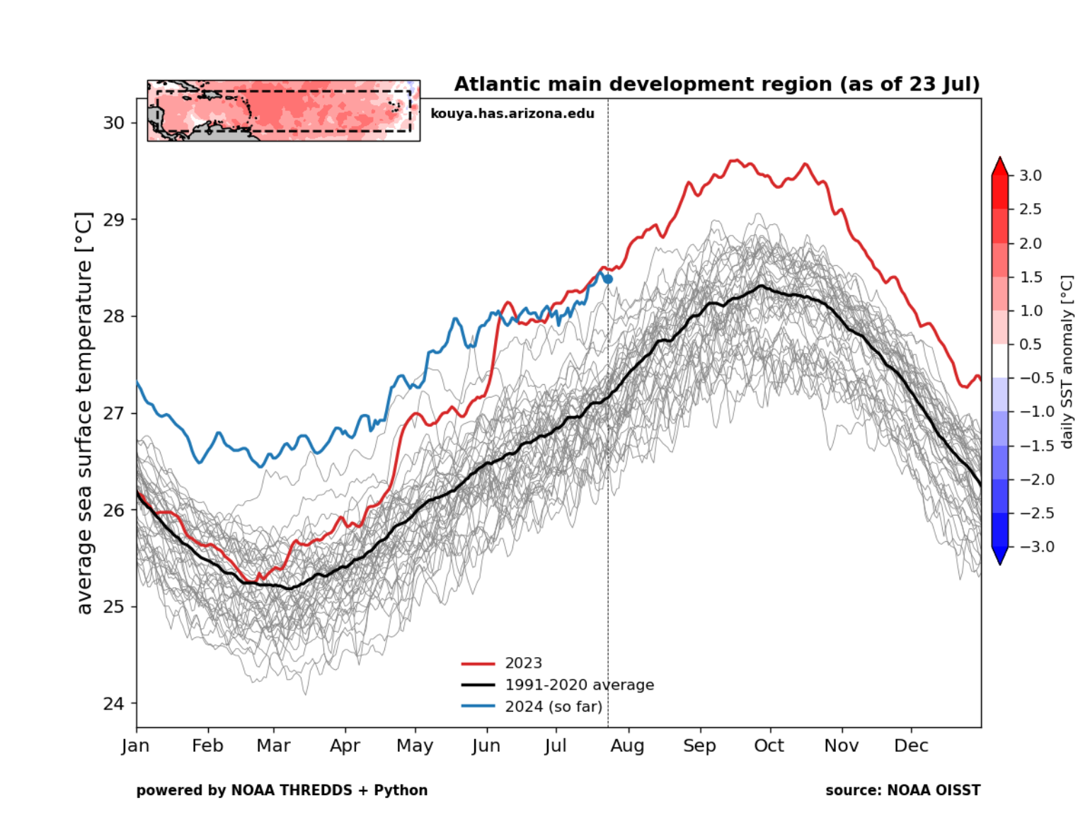 The plot provided by Michael also demonstrates that climatologically, we have passed the peak. This also indicates that the dust should become less of an impending factor as we enter August. When this element is combined with the fact that the MJO could be moving into a more positive active state over the Atlantic Basin the second week of August, the spring will be fully loaded. Less dust due to climatology, a rising phase of the MJO that is more conducive to thunderstorm development, near-record warm sea surface temperatures, and less wind shear due to cooling La Nina conditions in the tropical Pacific. These climate forcers provide the opportunity for a period of hyperactivity right at the peak of when climatological the insurance industry should expect the most activity.