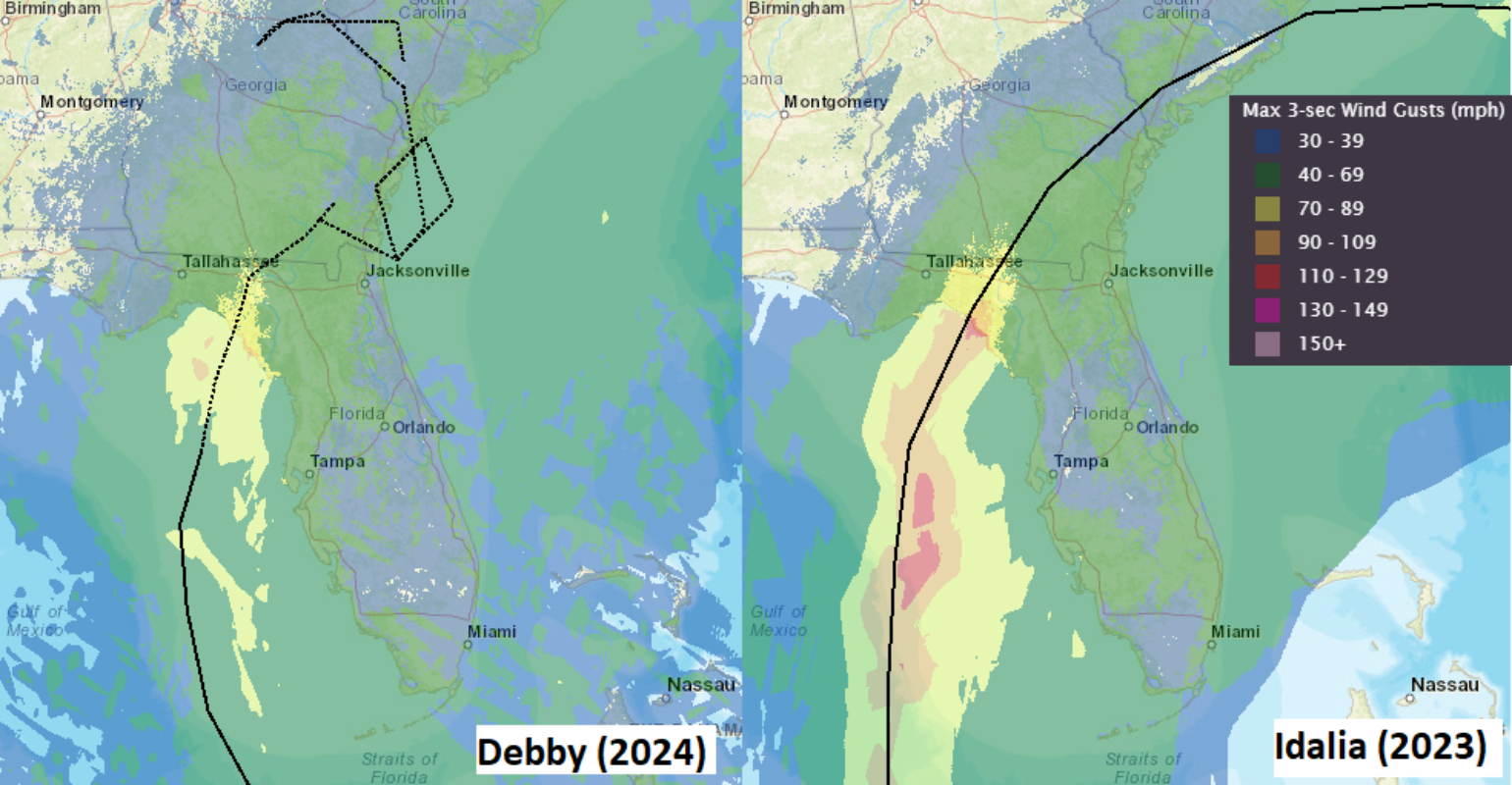 As the insurance industry looks to understand Debby's impacts, one might take the easy way out and cut and paste all the BMS Tropical Updates from Hurricane Idalia last year as they relate to Hurricane Debby and its impacts. Despite potential similarities, that cannot be done as the two systems have a few notable differences. Idalia can provide good insight into the impacts of the insurance industry as only 15 miles separate the landfall location around Steinhatchee, FL, as Debby made landfall with winds of 80 mph and a pressure of 979 mb around 7 am EDT.
